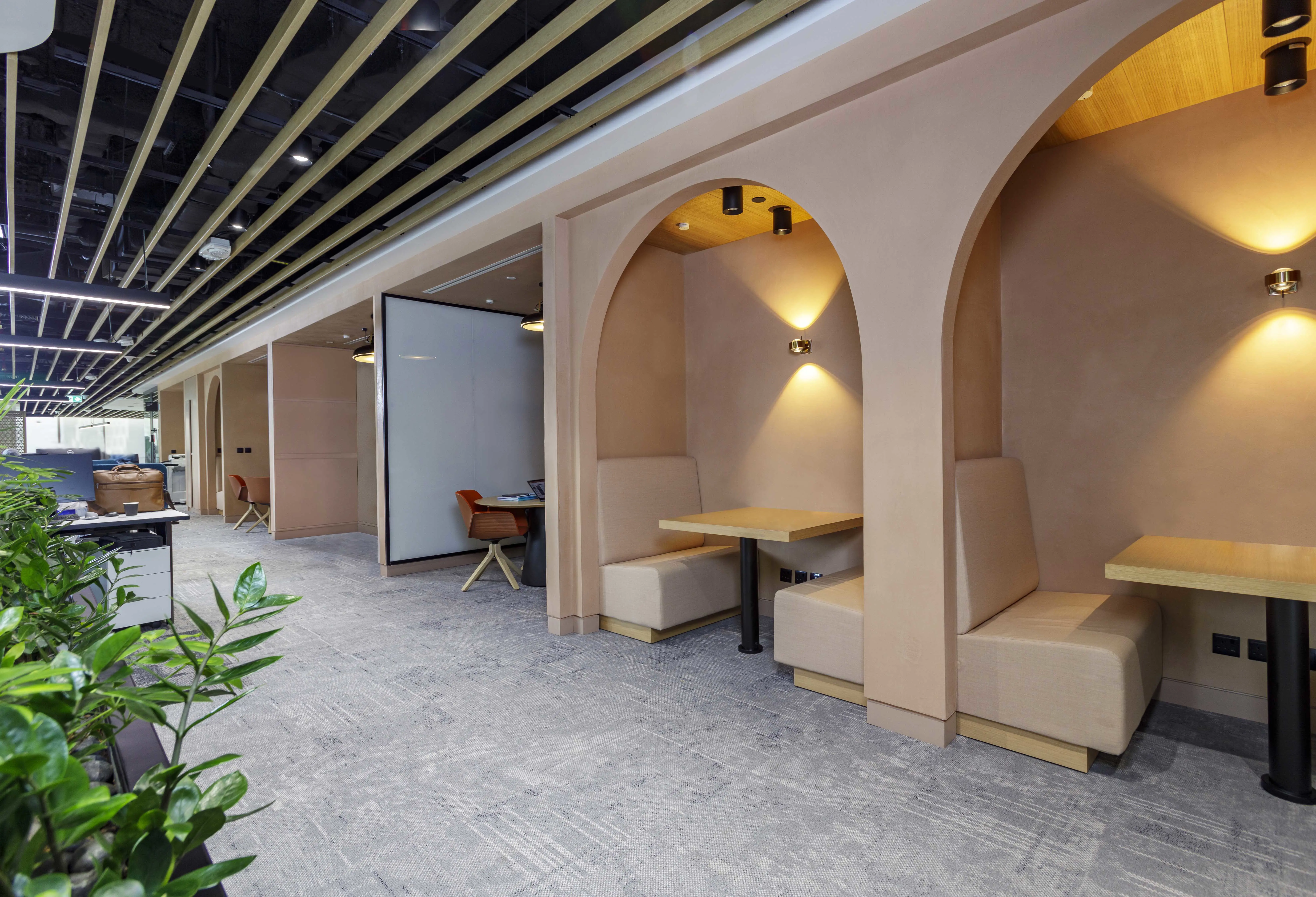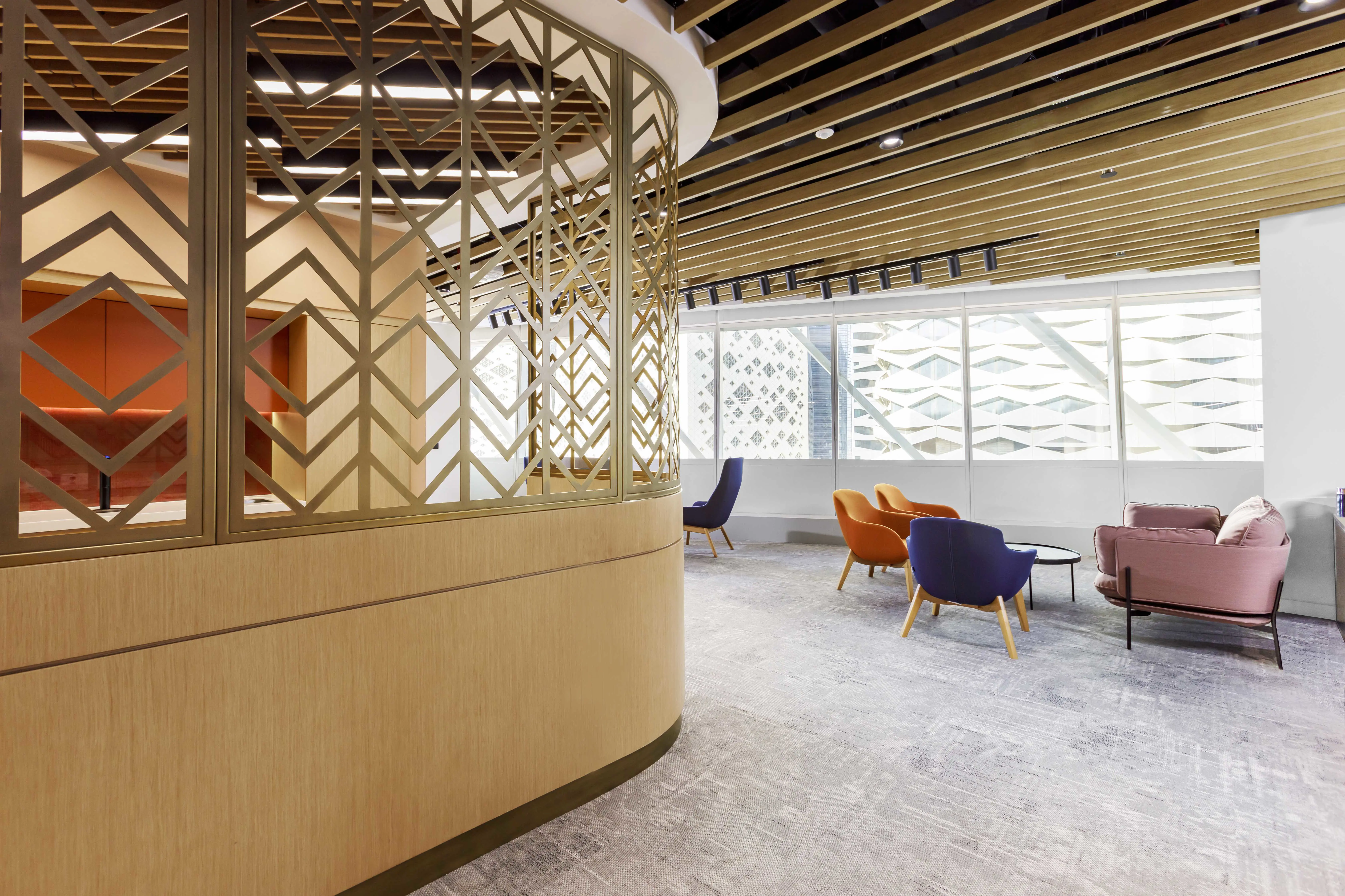 The overall design concept offers a contemporary take on traditional Saudi Arabian design and craftsmanship. A considered internal layout with a range of work settings distributed across multiple floors provides employees with choice, flexibility and ownership in how and where they work; a space that embodies the values of ROSHN. A new multi-purpose reception includes spaces for informal meetings and collaboration; an innovation area to display current projects and host new project launches and functions. On floors above, individual pods and enclosed booths allow for undisturbed focus while open plan deskwork spaces encourage informal exchange, and maximise natural light and views. A café located at the top of the building is a flexible sub-divisible social space, used by staff for presentations, wellness events, or simply to pause and take in the impressive views over the city.