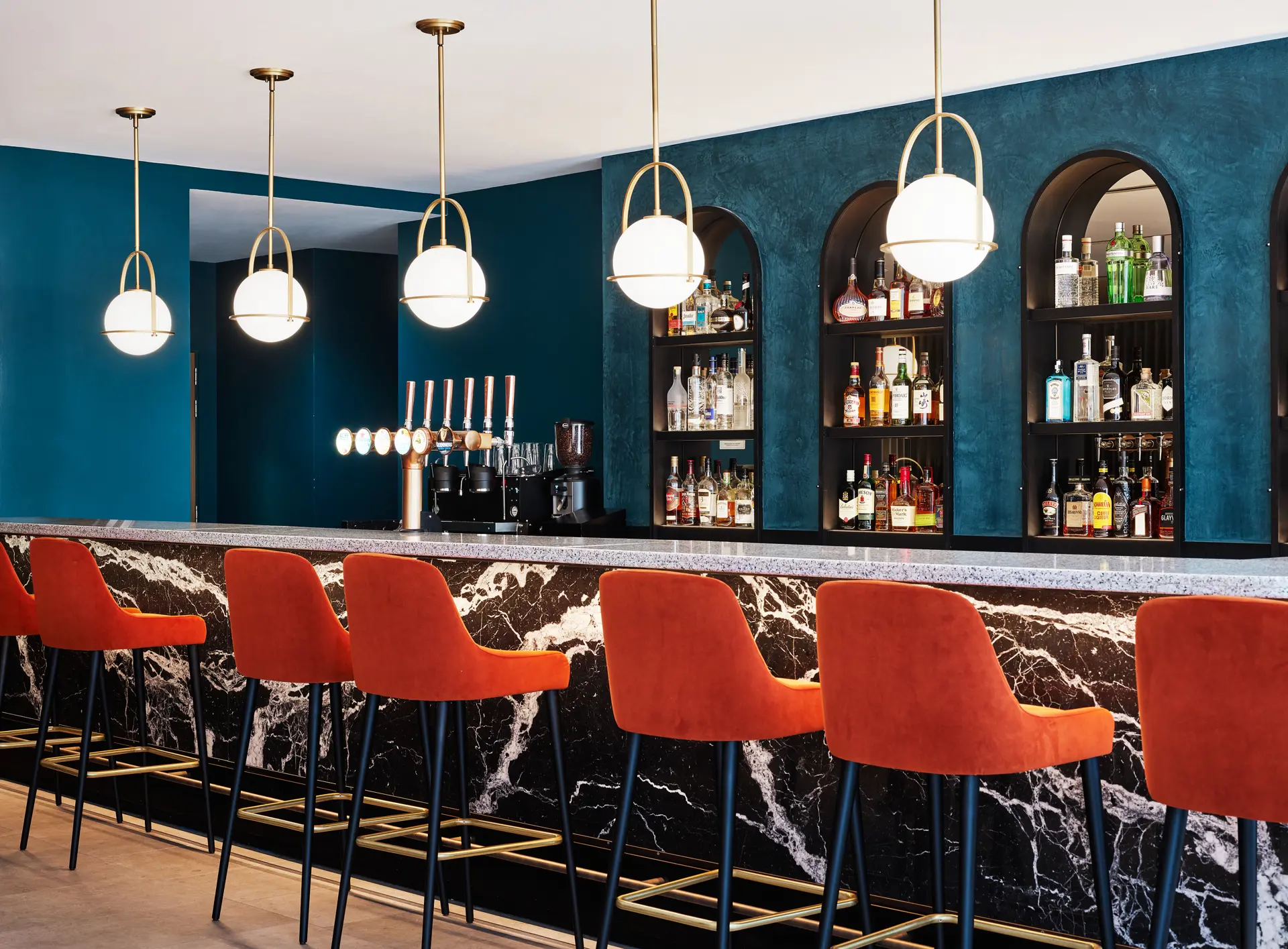 The interior design mirrors the connectivity of Stratford, with subtle nods to the Victorian Golden Age of train travel. Archways, typical of London’s railway, form entrances to common spaces and inspire bespoke detailing throughout. A rich palette of brass light fittings, marble fixtures and luxury velvet furnishings alongside jewel colours offer a contemporary take on the glamour and travel of the 1920s.