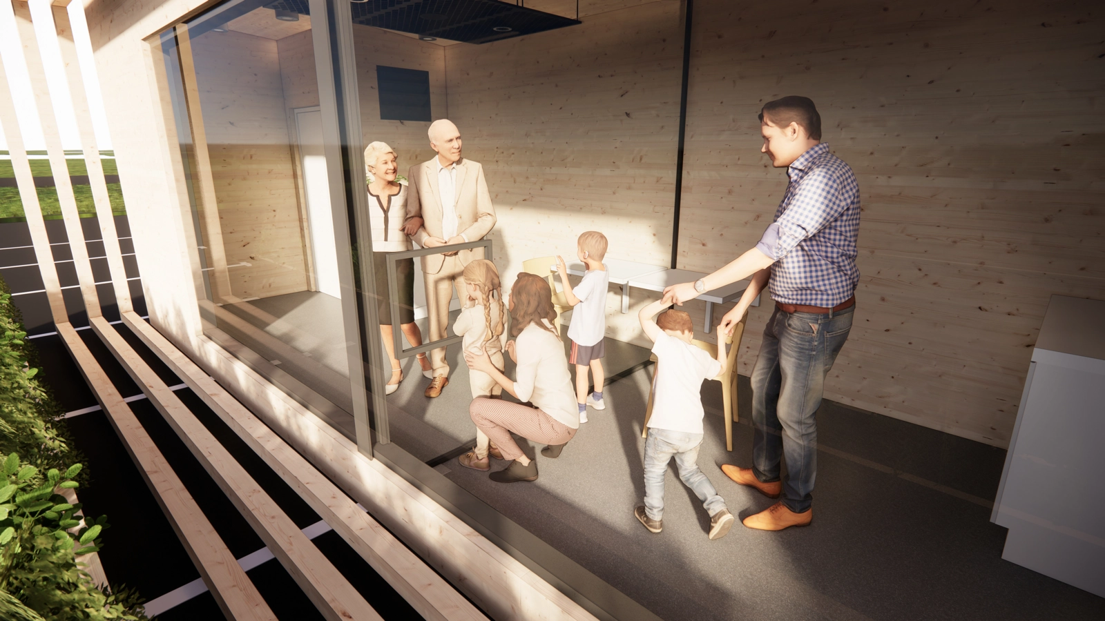 Neil Wylde from Hoare Lea notes: “It’s a privilege to be able to address one of the many emotional challenges that people are experiencing due to Covid-19. Through the design of the Social Contact Pod, we hope to be able to bring back the much-needed physical connection that so many families and friends are craving. For a project like this, where safety is paramount, the internal environment and engineering is incredibly important. We focused on ensuring the space will improve the wellness of those who occupy it. Ultimately its off-grid design makes it not just a space that can provide precious moments for families and friends, but one that looks to how we can design for a better future.”