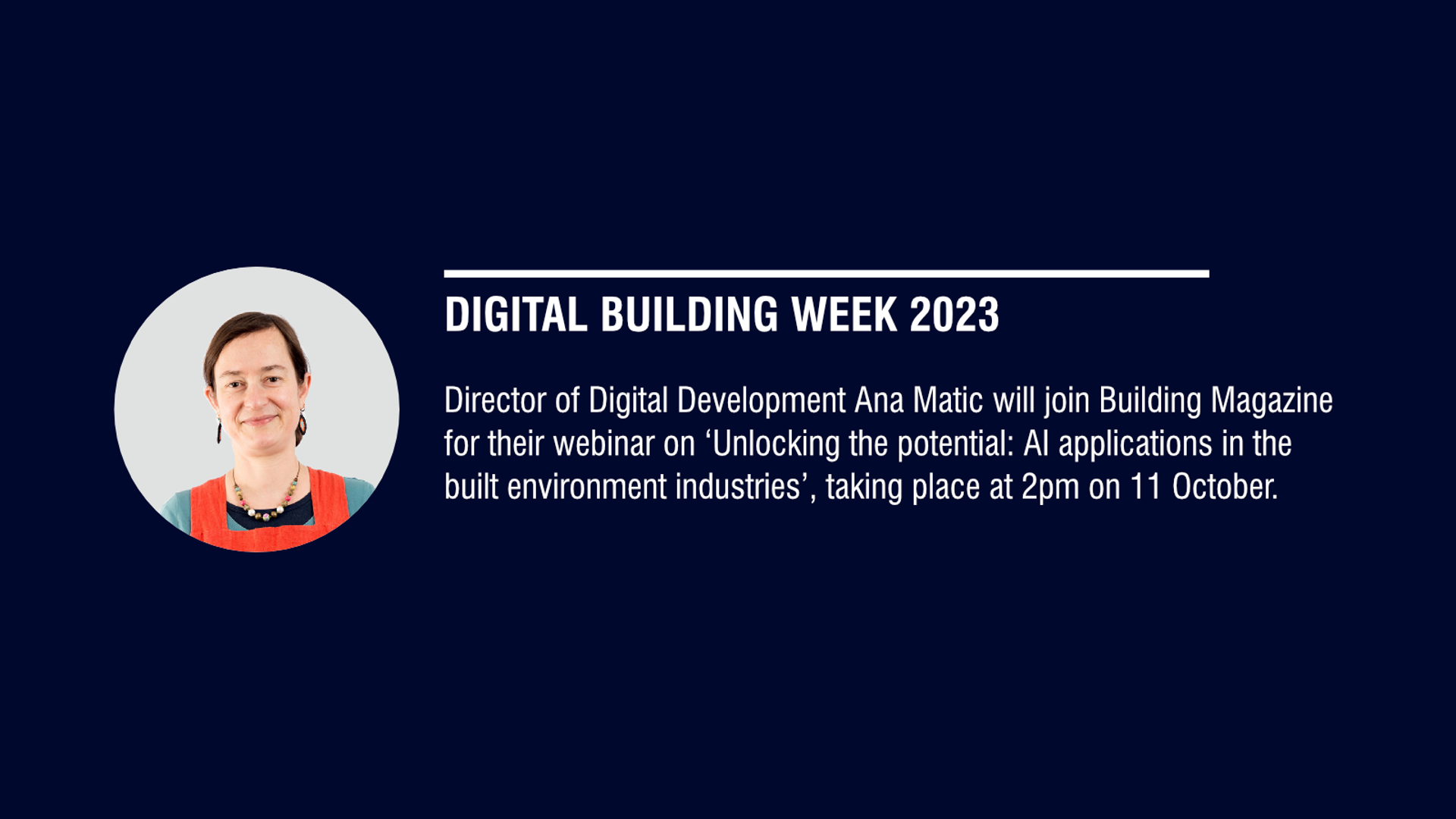 As part of Digital Building Week, Director of Digital Development Ana Matic will join Building Magazine and their webinar on ‘Unlocking the potential: AI applications in the built environment industries’, taking place at 2pm on 11 October.