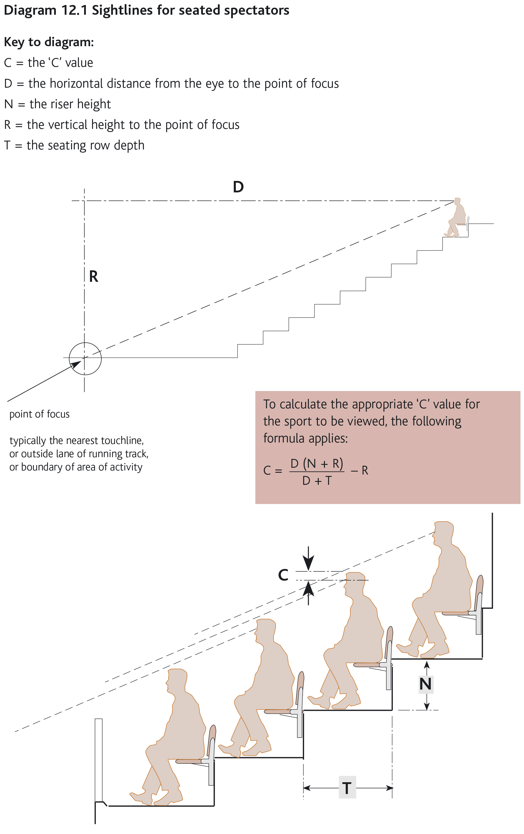There is an ebb and flow between when the crowd inspires the players and when the players inspire the crowd. This is facilitated by several things – acoustic properties are important, but good sight lines and an unobstructed view of the action, combined with a terraced section that provides those good sight lines but with physical intimacy to the playing area, are perhaps even more significant. Here, the Green Guide again provides useful design criteria for establishing a good spectator experience. The measurement is called the ‘C’ value and is calculated by using the diagram shown.