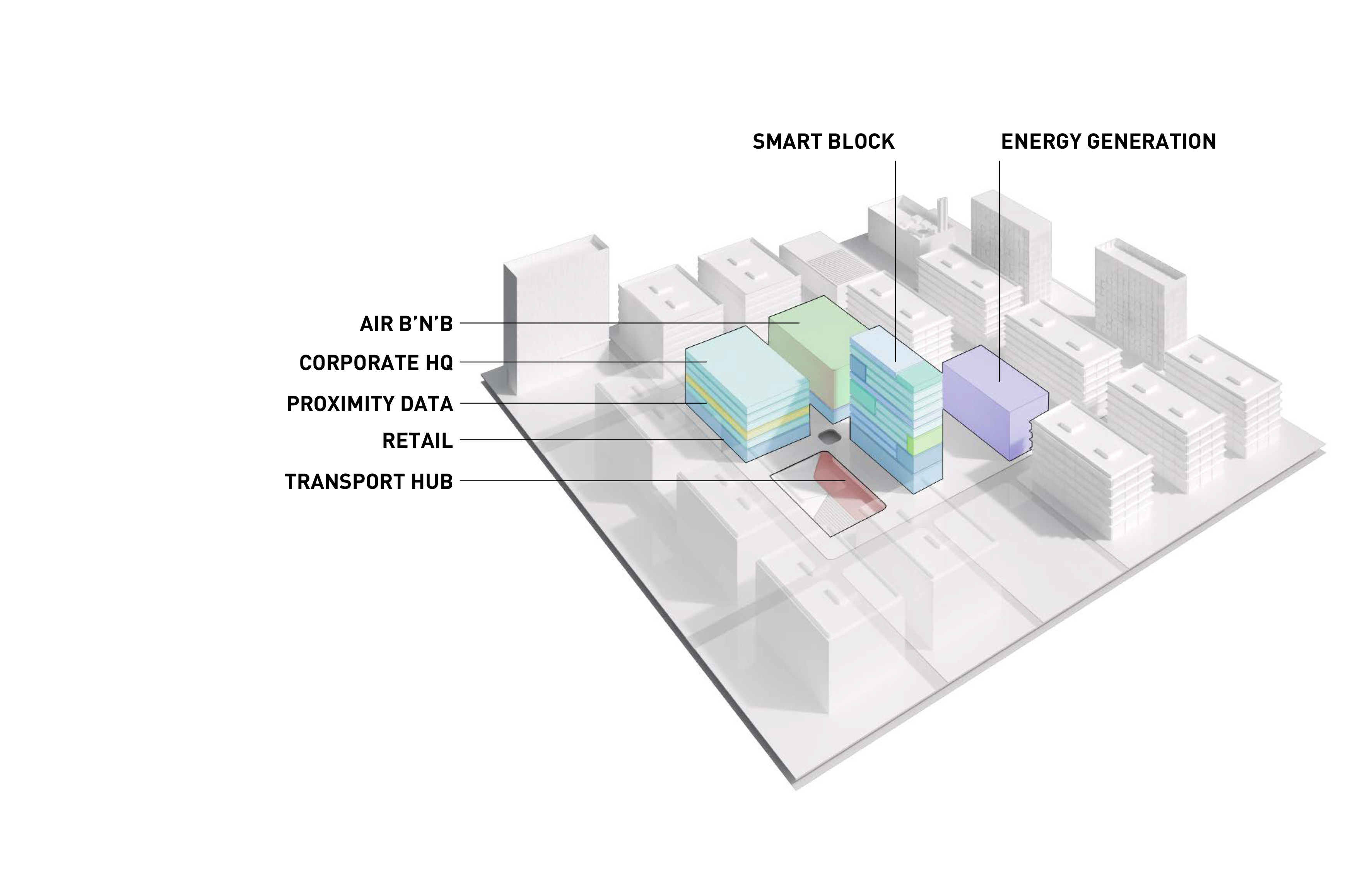 As a self-contained urban element the Smart Block responds to a new form of urbanity for the digital economy which has been described as a clustered network.