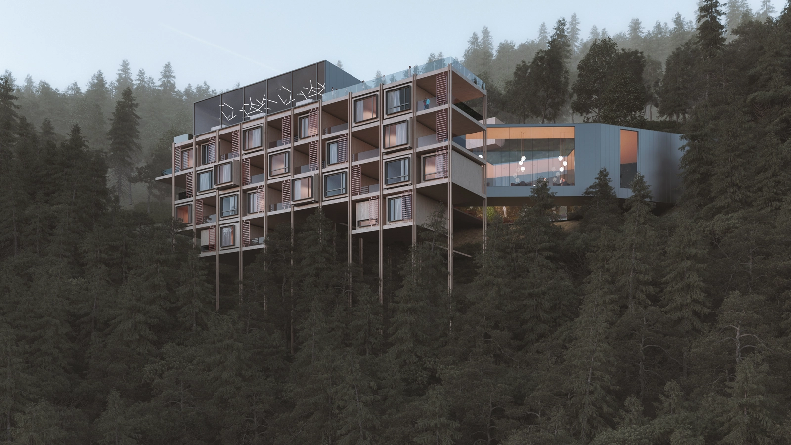 All of this mapped a rich narrative for our use in the concept design and organisation of the proposed masterplan. For instance, in the use of engineered timber sheets, a 1200mm panel size was an optimum dimension that could be fabricated and would result in little waste material on or off site. All buildings and dimensional criteria would use this ‘rule’ to establish an aspect of the masterplan’s spatial characteristics in a wholly sustainable way. Even buildings that require long spans or on difficult parts of topography are conceived in timber – glulam or composite frames as well as the skin and external walls. The Karearea (The Hawk’s Nest) hotel is a typical example of how this is manifest. A slender timber frame that moderates the severe slope is occupied by modular bedroom units that are simply slotted into place.