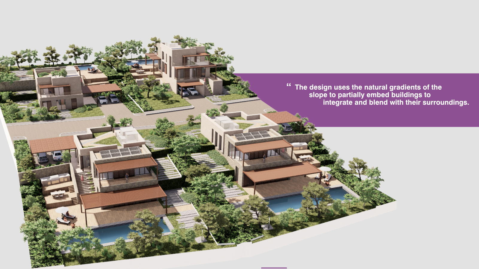 The villas are made of locally available materials including stone, mud-brick and timber, and are in many cases partially built into the earth. This earth-sheltered design maximises use of the natural insulating properties of the soil, and further increases the protective thermal mass. Gardens are positioned to maximise the optimum aspect and sun path whilst terraced to respond to the sloping topography defined by different zones within the contoured sequence, helping to prevent soil erosion by reducing rainwater runoff. The material palette, landscaping and partial embedding of villas into the ground, allows for the buildings to blend harmoniously with their surroundings.