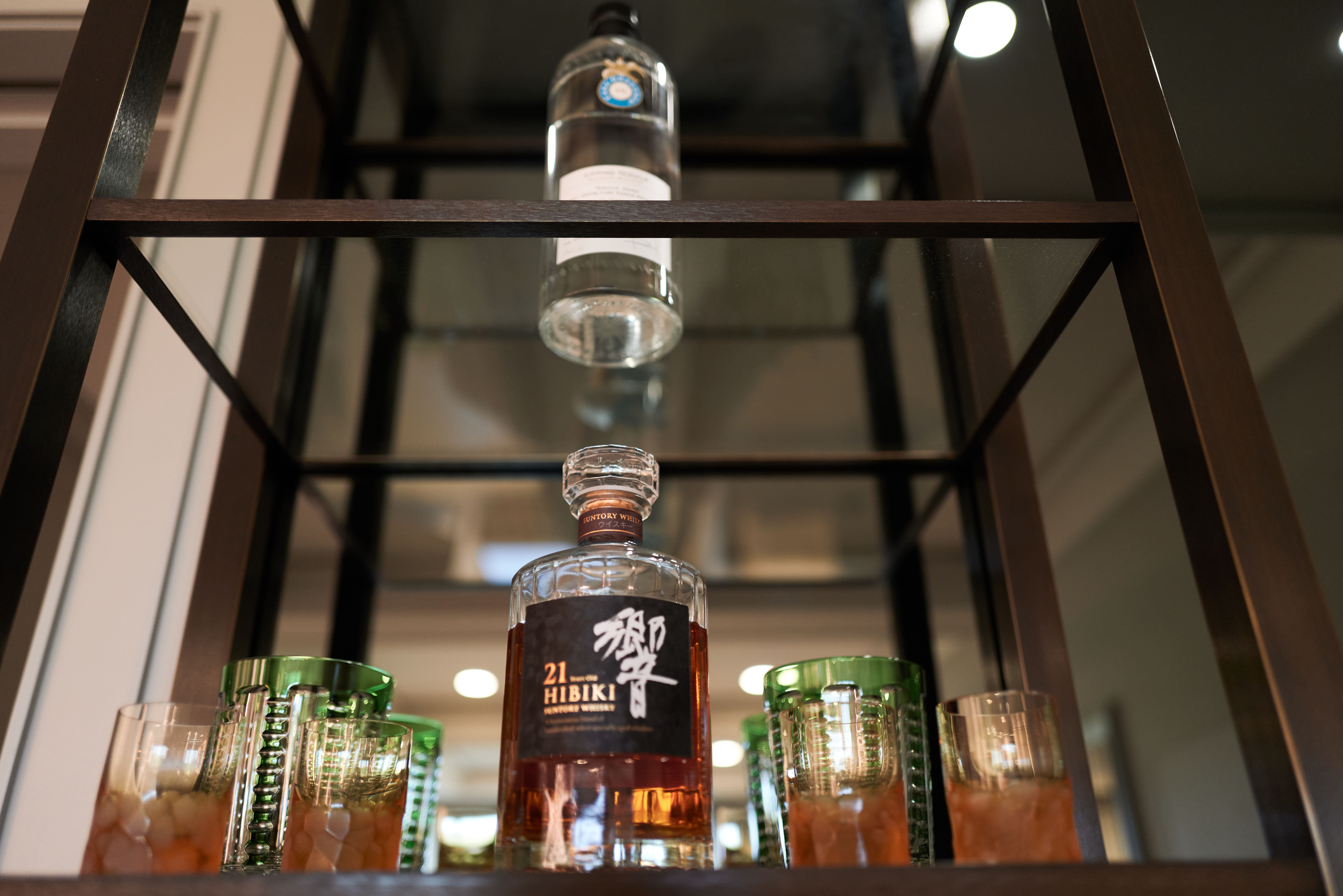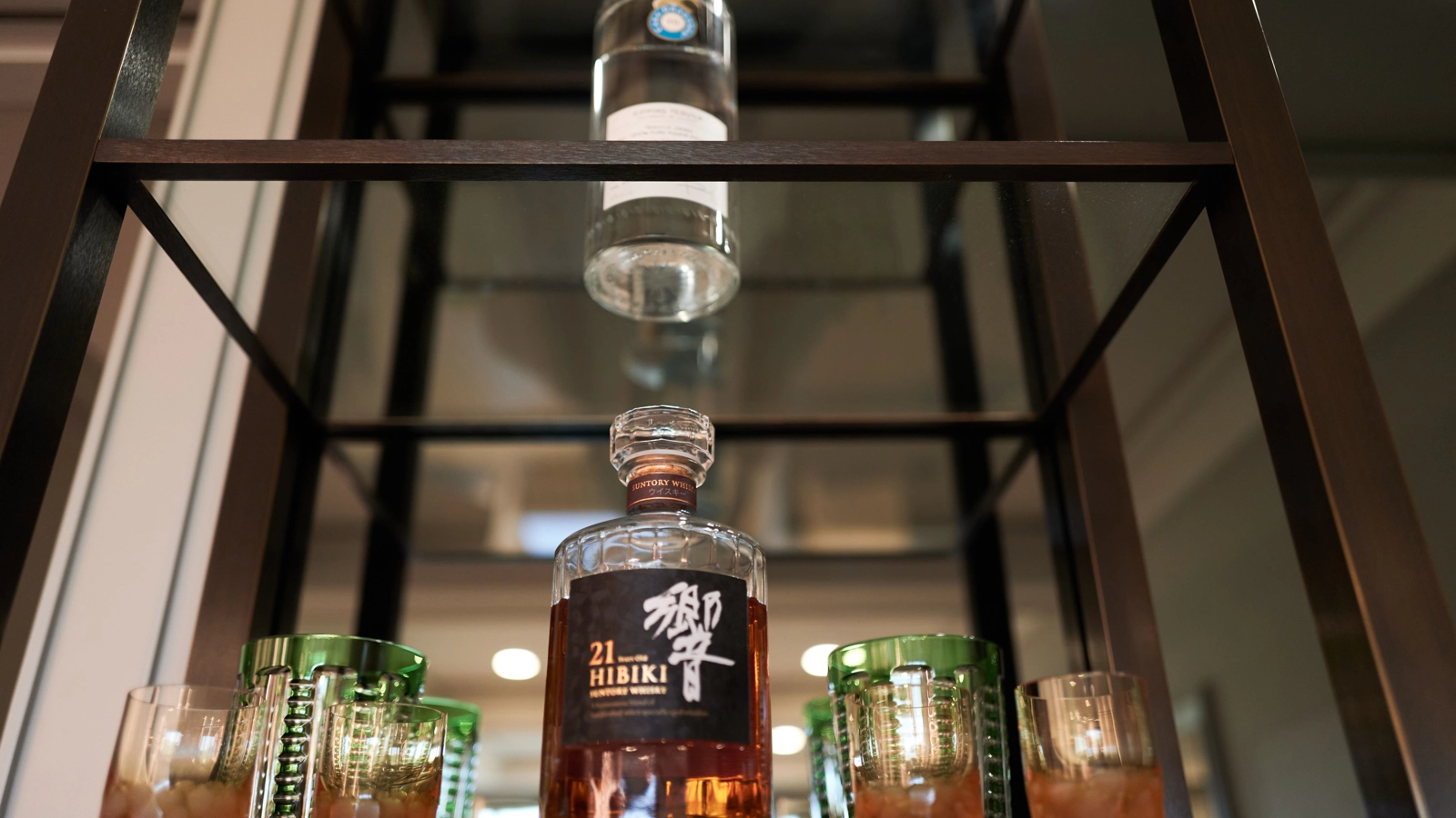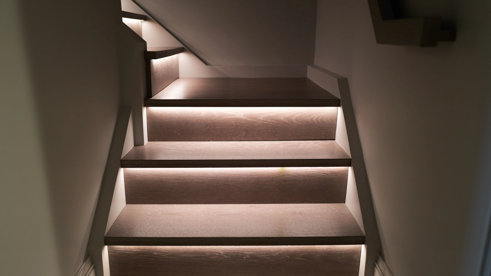 The soft scheme of beige and grey is complemented by hints of rich marble and gold fixtures. LED lighting is consistently used throughout the space to highlight the shelving, cabinets and staircase. The kitchen and bar include state of the art stainless steel appliances and sleek marble finishes to tie in with the ash wood floors.