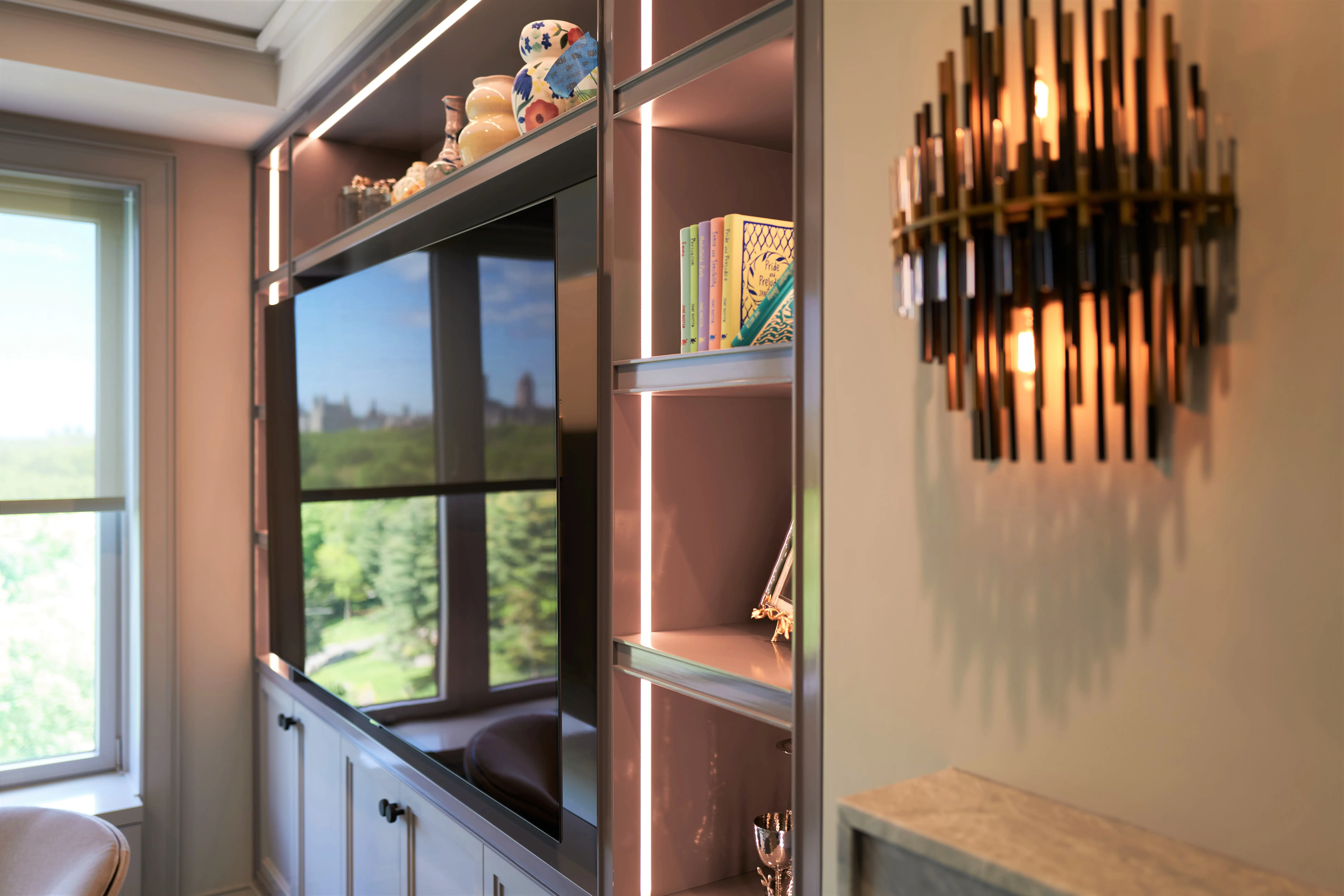 The focus of the master bedroom is the magnificent view of Central Park, with a side fireplace and high coffered ceilings to accentuate the space. The colour scheme of the children’s bedrooms tie in with the rest of the apartment, and the striking cloud-like fixture creates a dreamy environment.