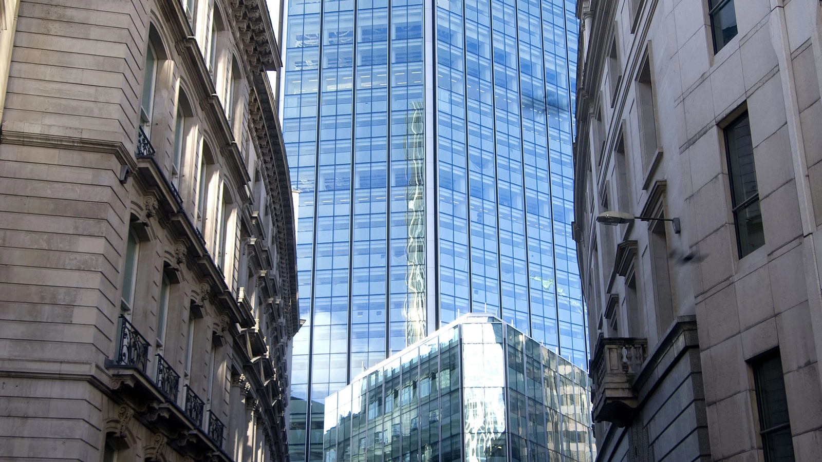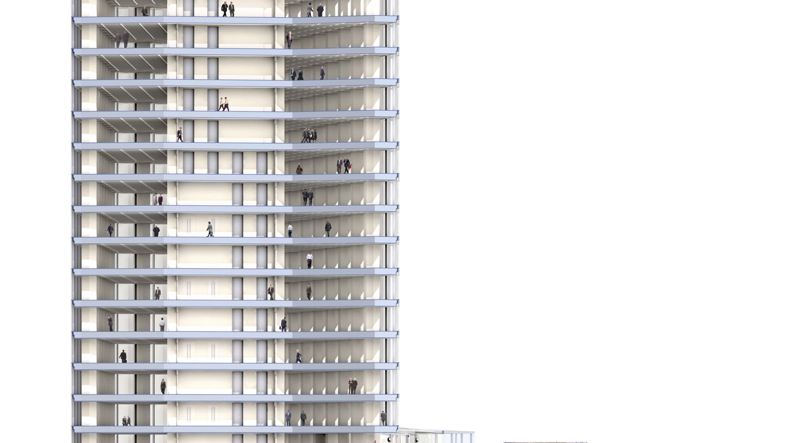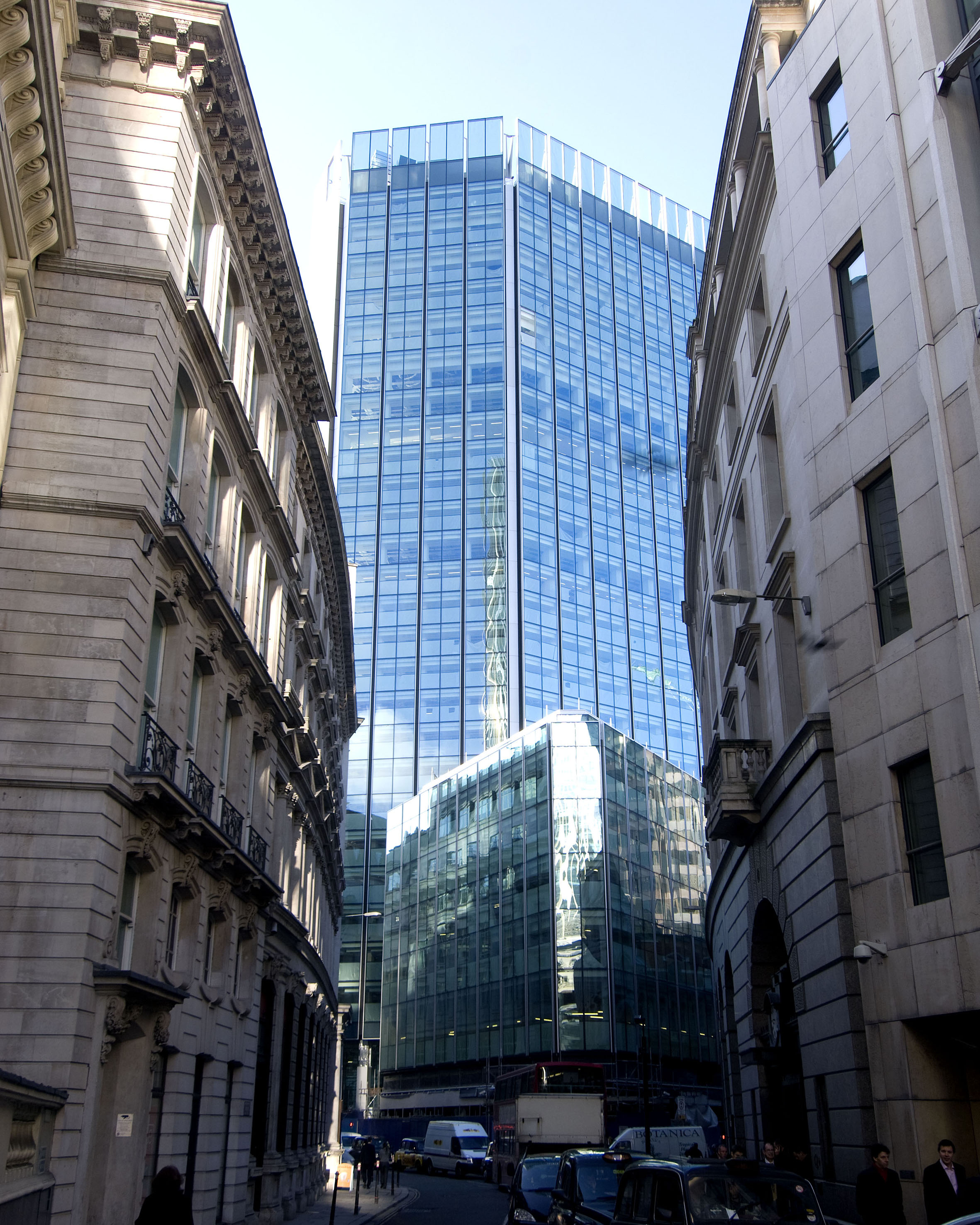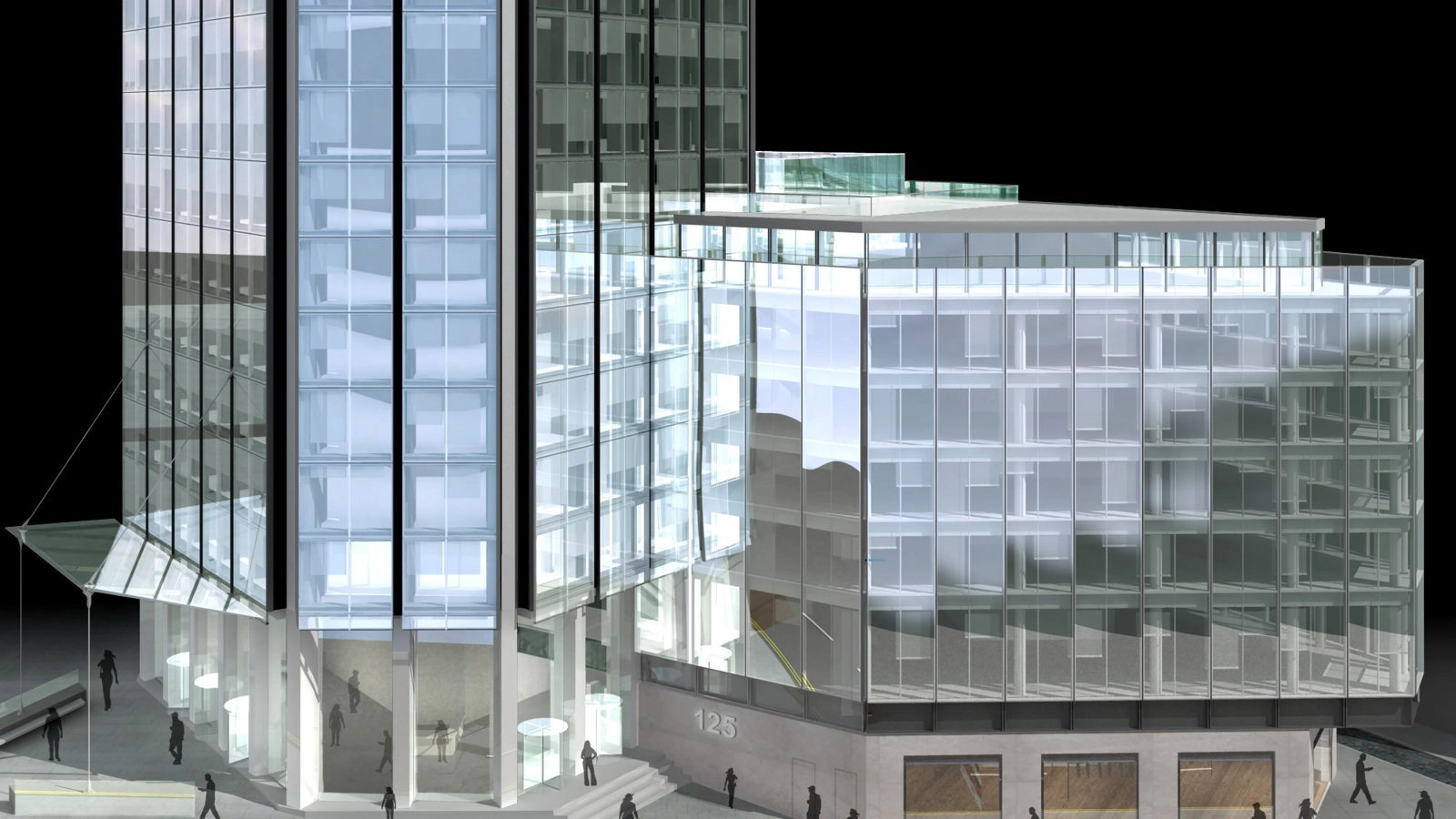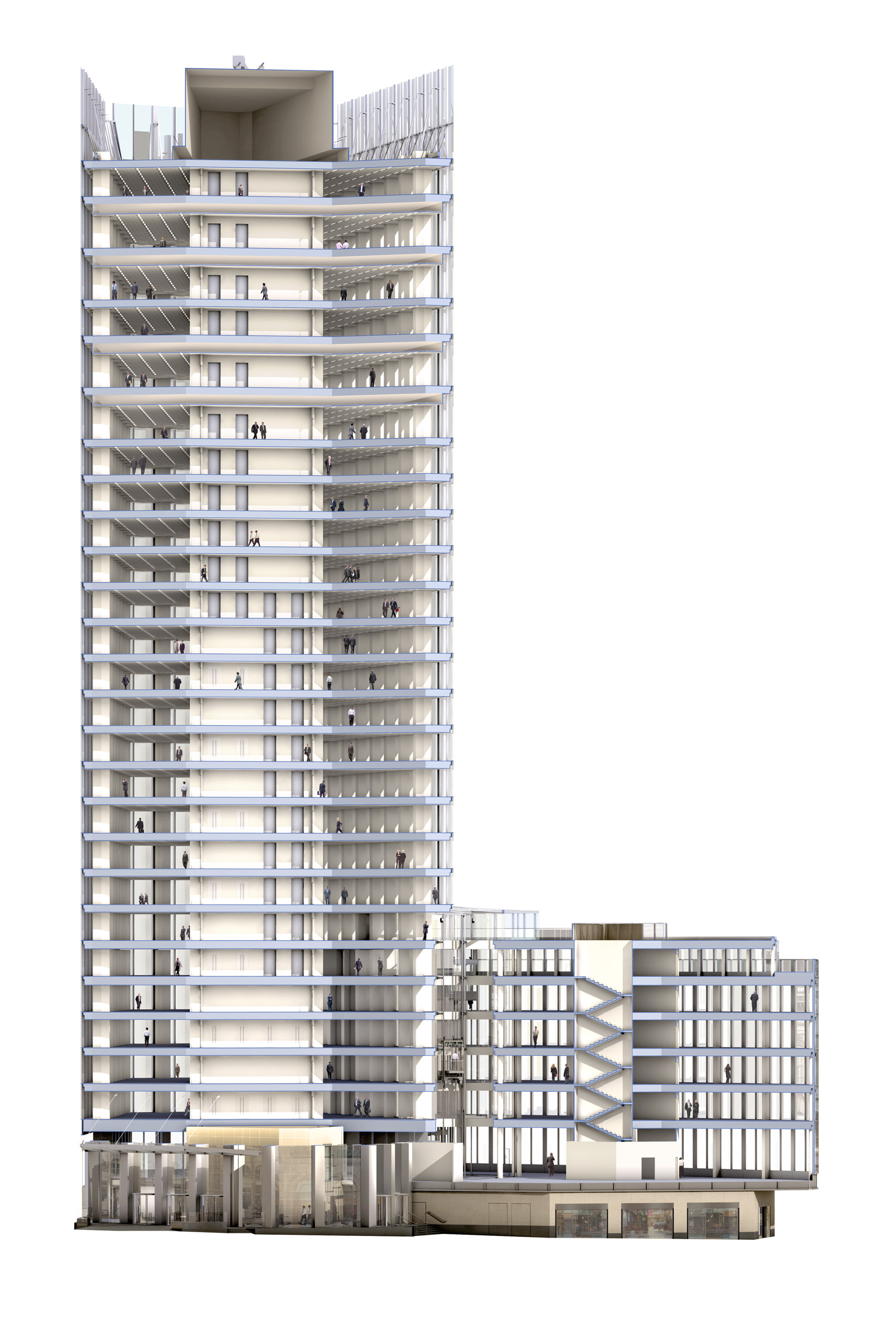 The uppermost translucent cladding panels soften the transition between building and sky. The original podium has been demolished and a new seven-storey building constructed in its place, providing the six lower levels with floors of approximately twice the area of the tower floors above. The ground floor has been opened up for retail and restaurant use and creates a lively urban focus for the area.