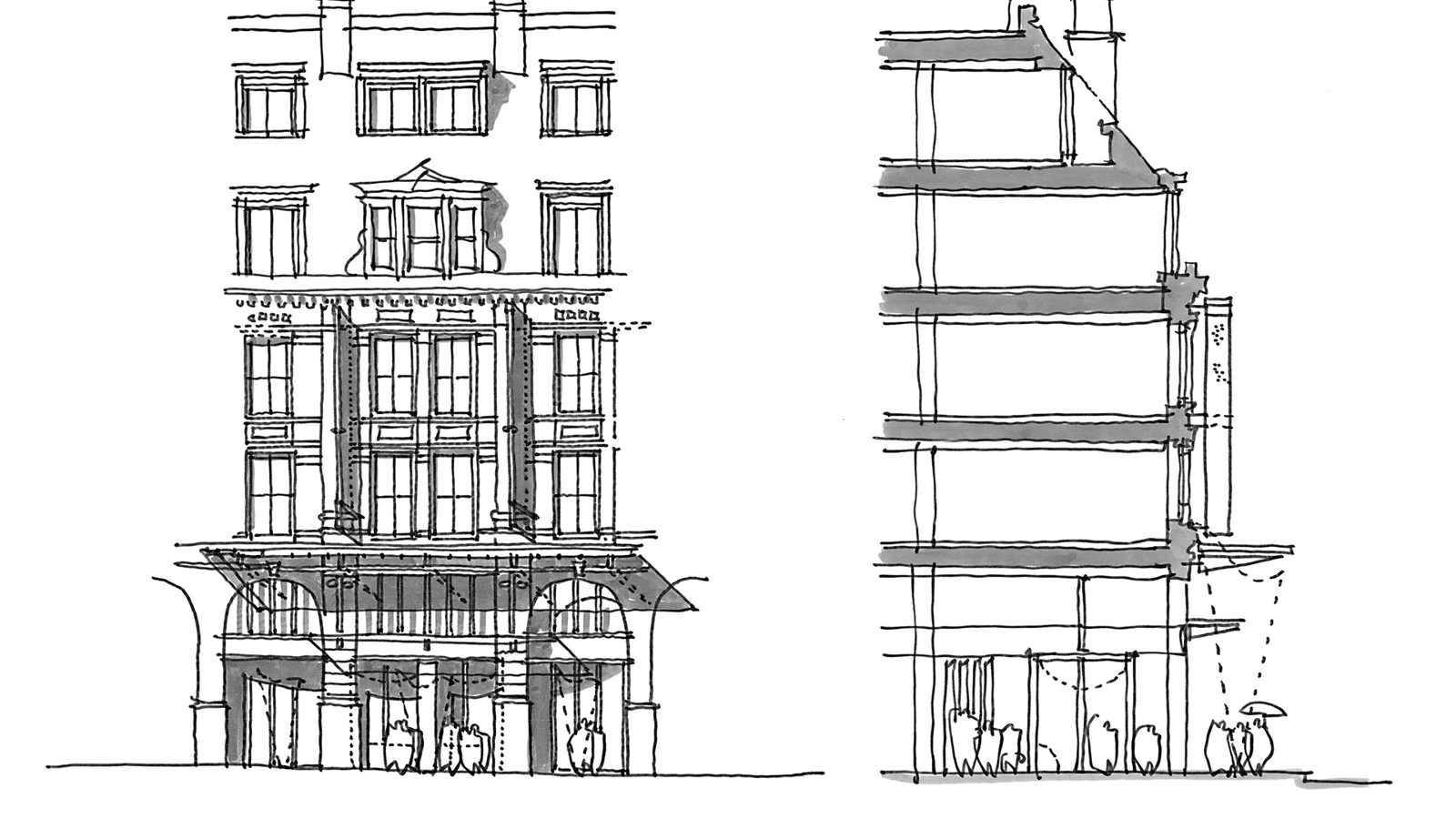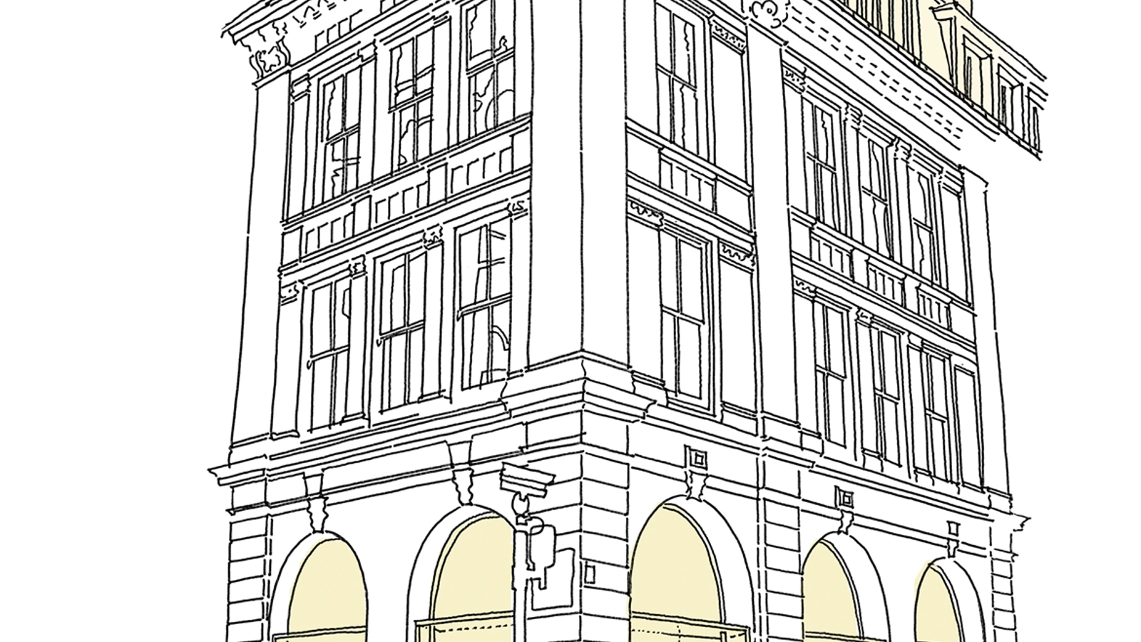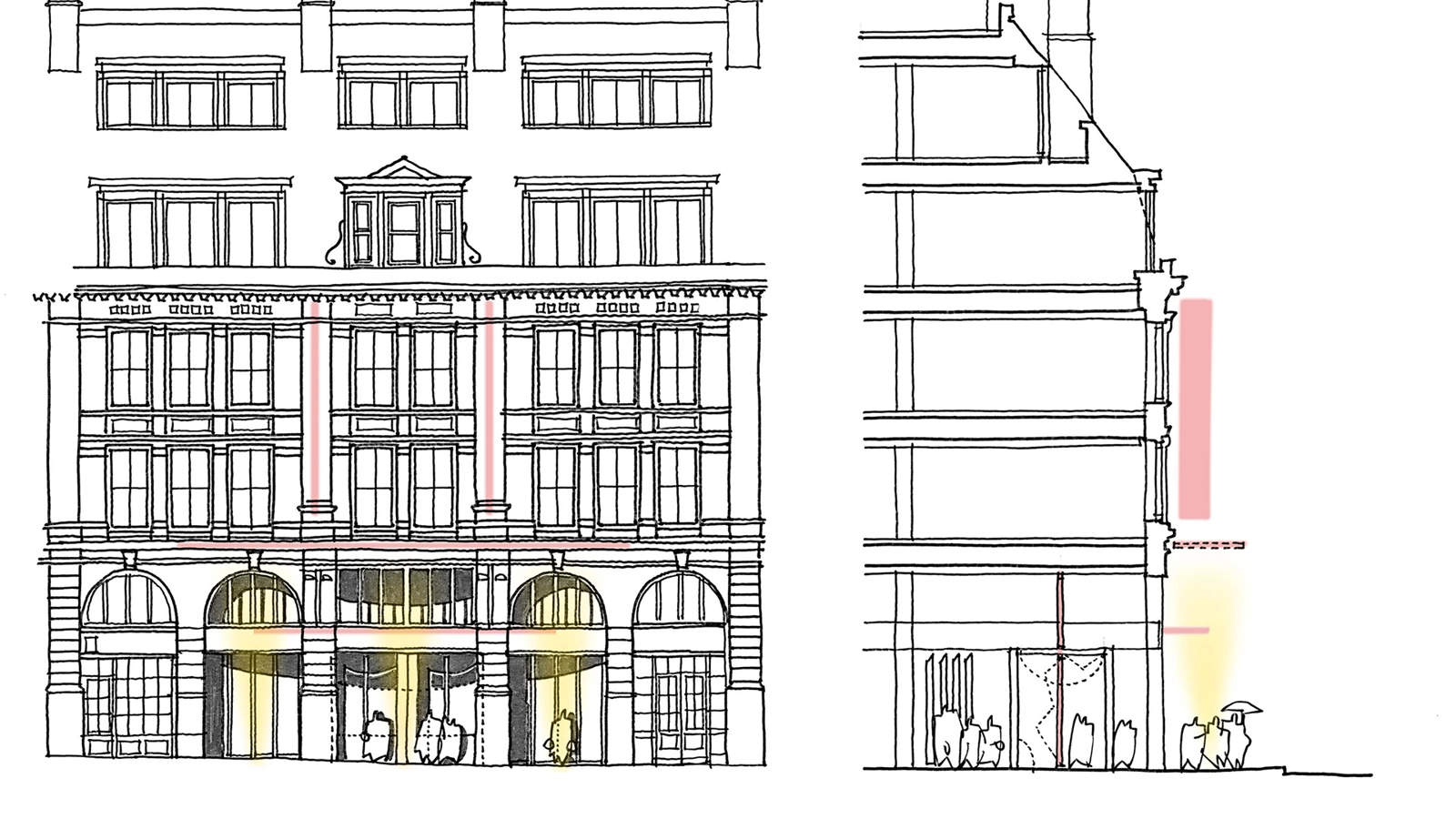Above the main parapet line, the office space is set back and expressed as a simple glass enclosure lit by a central atrium space. You enter the offices through the central arch of Lonsdale Chambers via a new sinuous glass canopy, providing a contrast to the monolithic character of the stone façade.