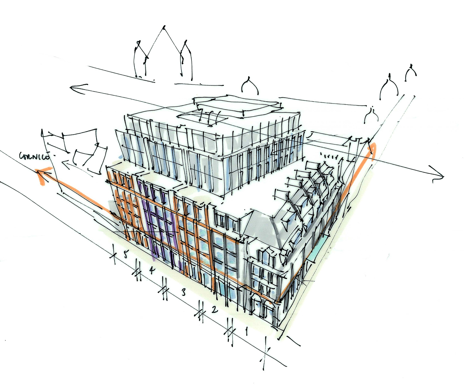 Briefed to remodel and rationalise a previously approved scheme for two buildings, we have created one highly efficient building which allows for 40% more lettable floor space – combining 98,000 sq ft of flexible, contemporary office space with 6.500 sq ft of ground floor retail space.