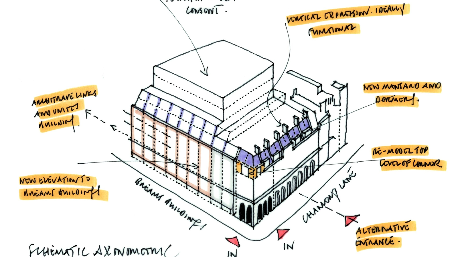 We modelled and articulated the building carefully, acknowledging both the historic and flamboyant nature of Chancery Lane and the more modest qualities of the neighbouring Bream’s Buildings. We combined the retained façade of Lonsdale Chambers on Chancery Lane with a distinctive contemporary office building, complementing the streetscape of the surrounding area.