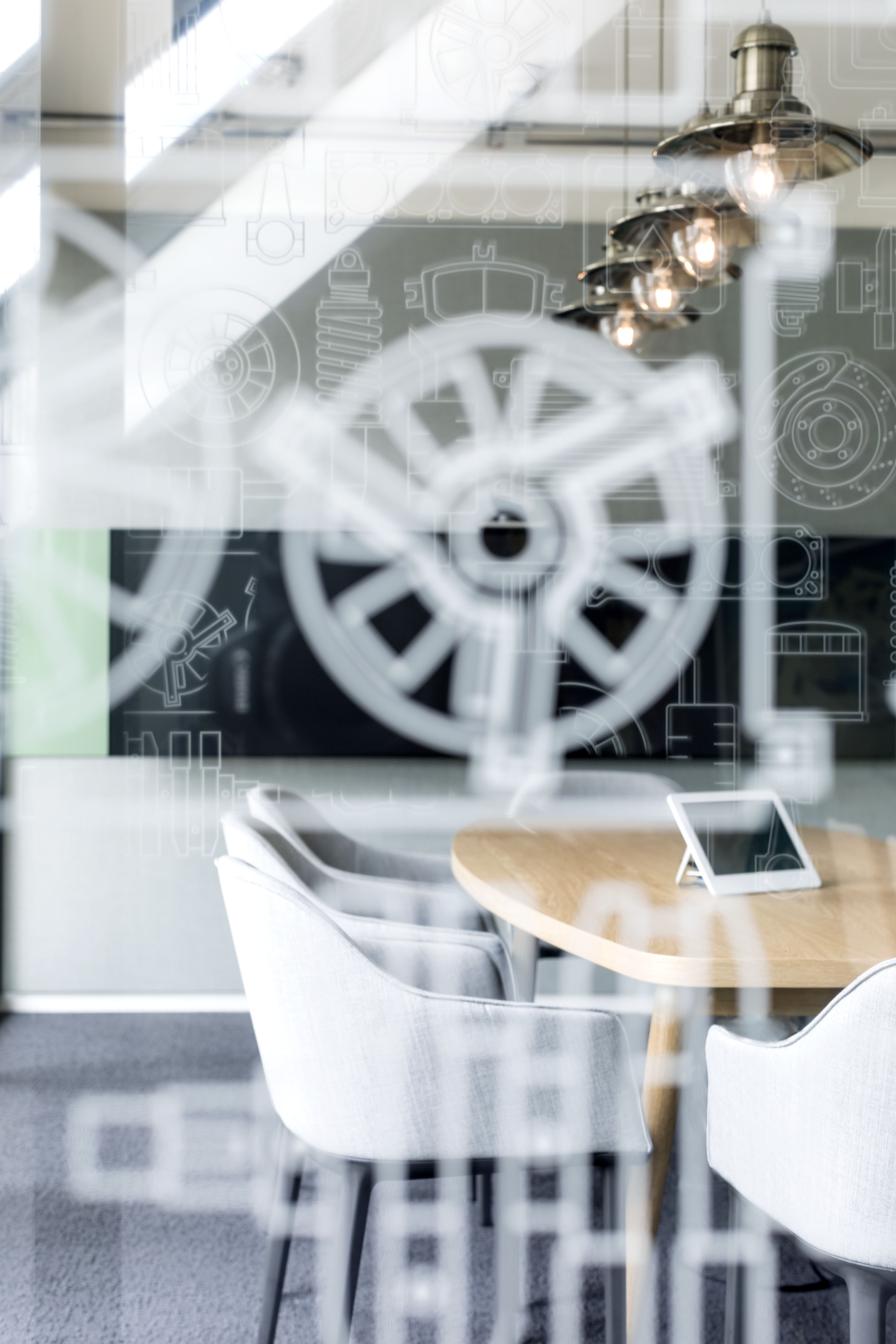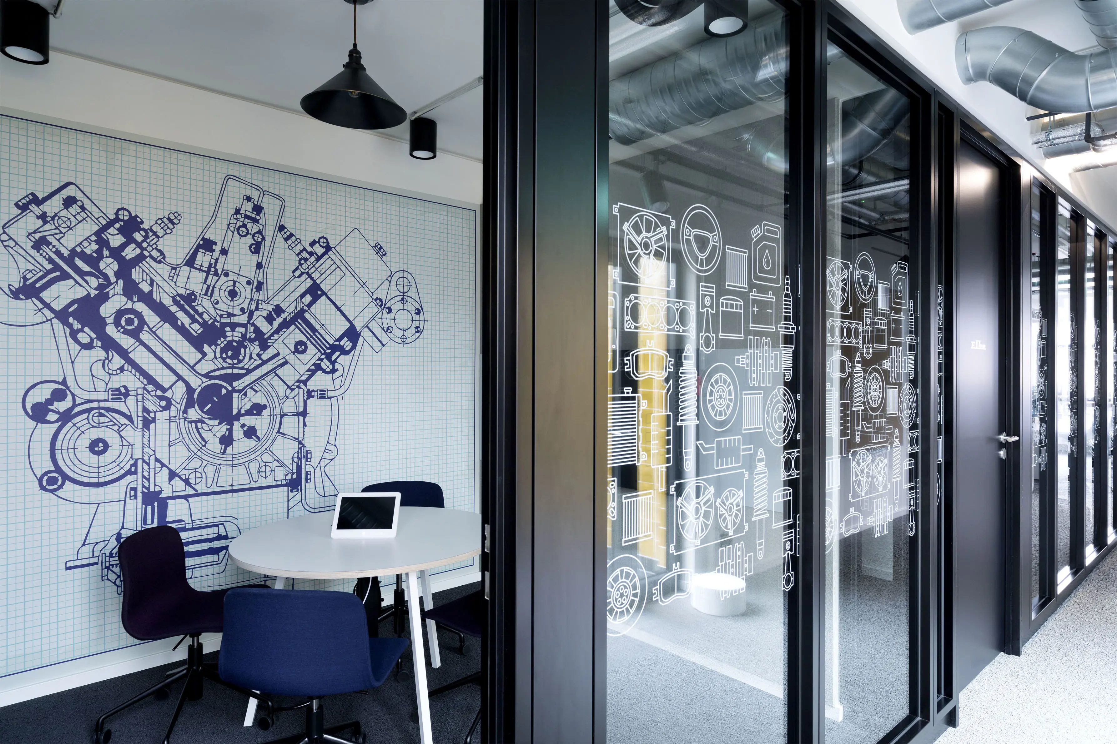 To achieve this we decided to express the emotional experience of car travel by introducing large-scale panoramic landscapes reminiscent of memorable road trips past. Knowledge of classic and technologically advanced cars is a key asset for the online car rental company. We illustrated this by incorporating full scale mechanical blue-prints of car engines in meeting rooms, together with icons of car components which have been dotted around the transparent glazed partitions.