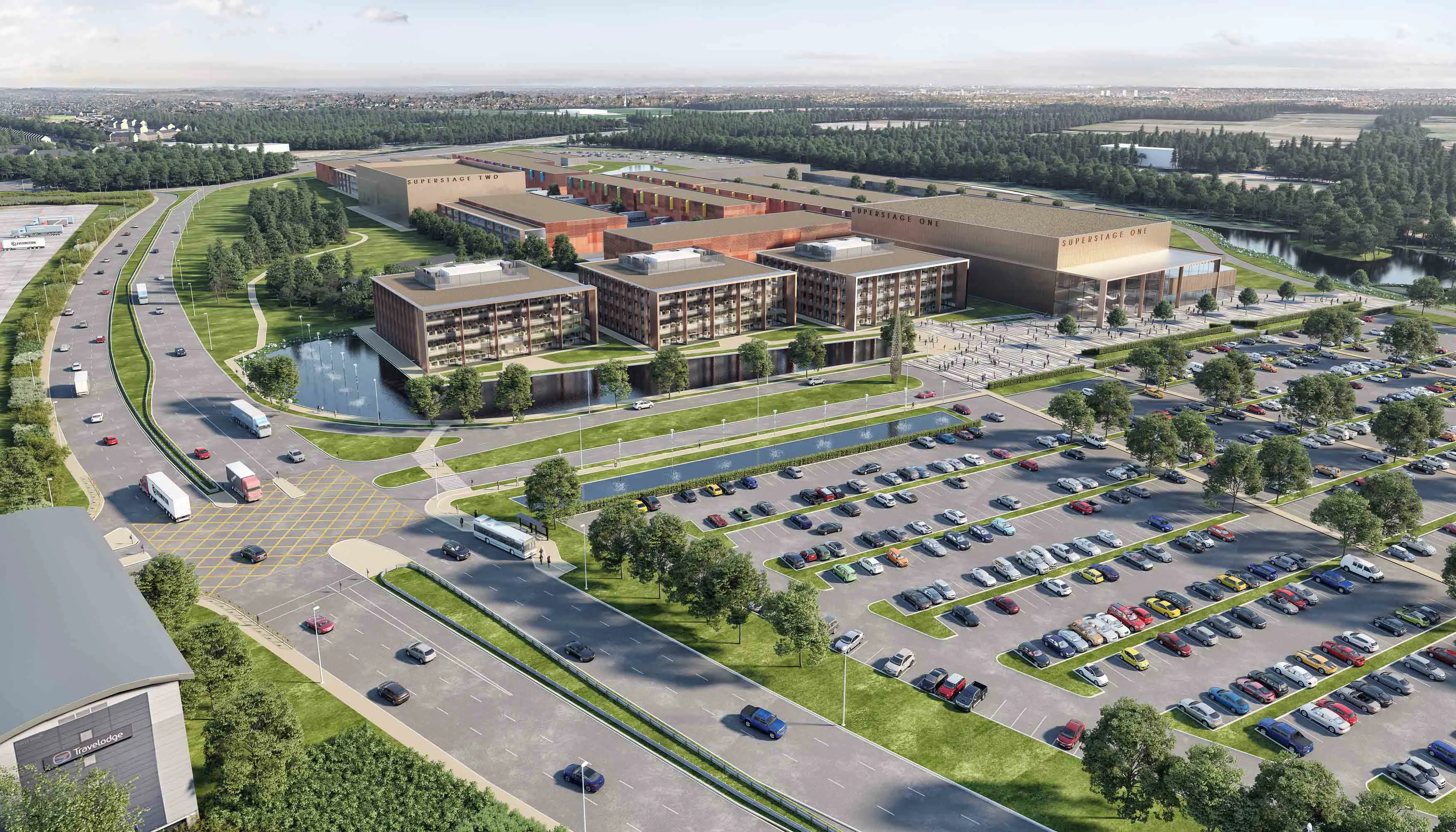 Working closely with the client, the masterplan evolved into a campus style layout including a major park to promote the health and wellbeing aspects of business and education lifestyle. The design includes workshop facilities, TV studios, 20 stages of various sizes, 275,000 sq ft office space and a 2,500 person auditorium connected to a music centre. A four-storey University building frames the entrance to the site.