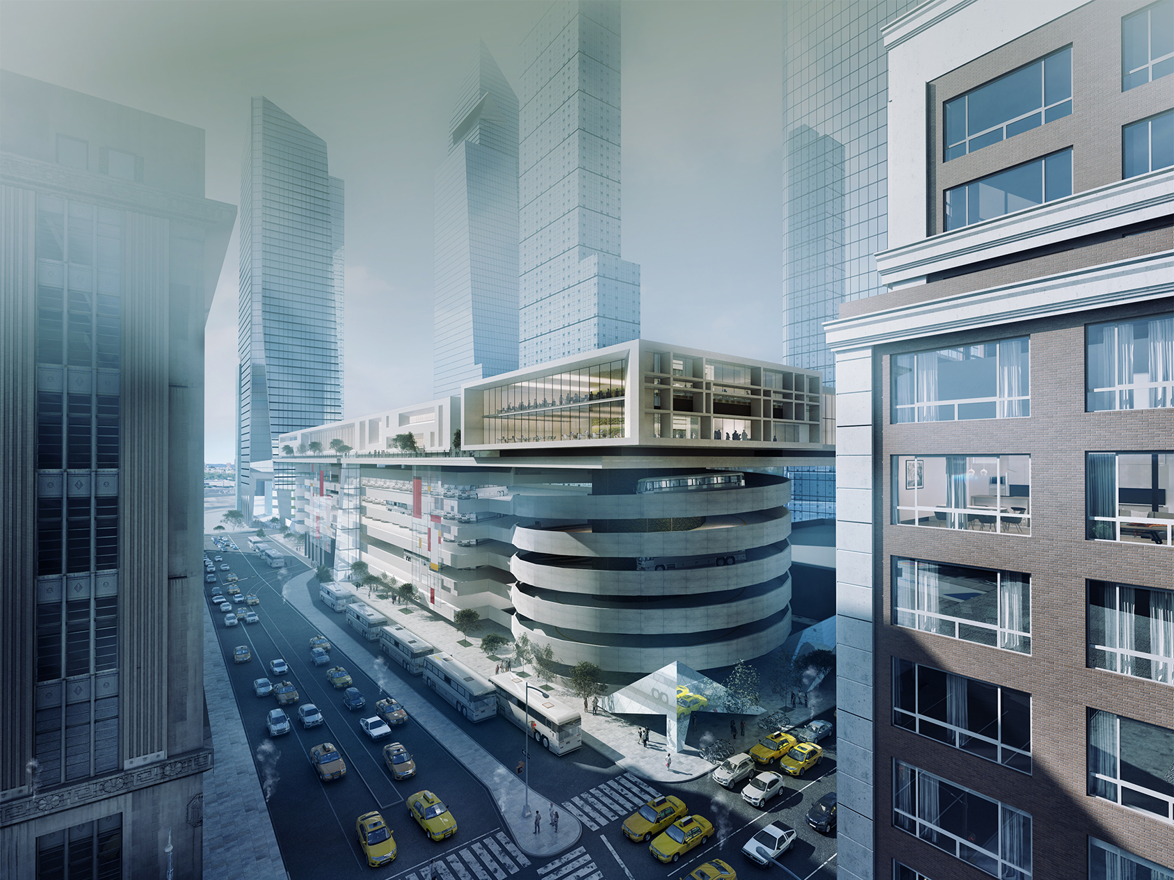 The first phase looks at a new intermodal transportation center, creating a much needed new platform and concourse space for Pennsylvania Station. Above the station the proposed superstructure includes over 270 bus bays for the relocated Port Authority Bus Terminal, retail and other commercial uses including new headquarters for Amtrak and the Port Authority. The bus connection levels are conceived in a way to accommodate changes in demand, autonomous parking and flexibility for the evolution of bus transport.
