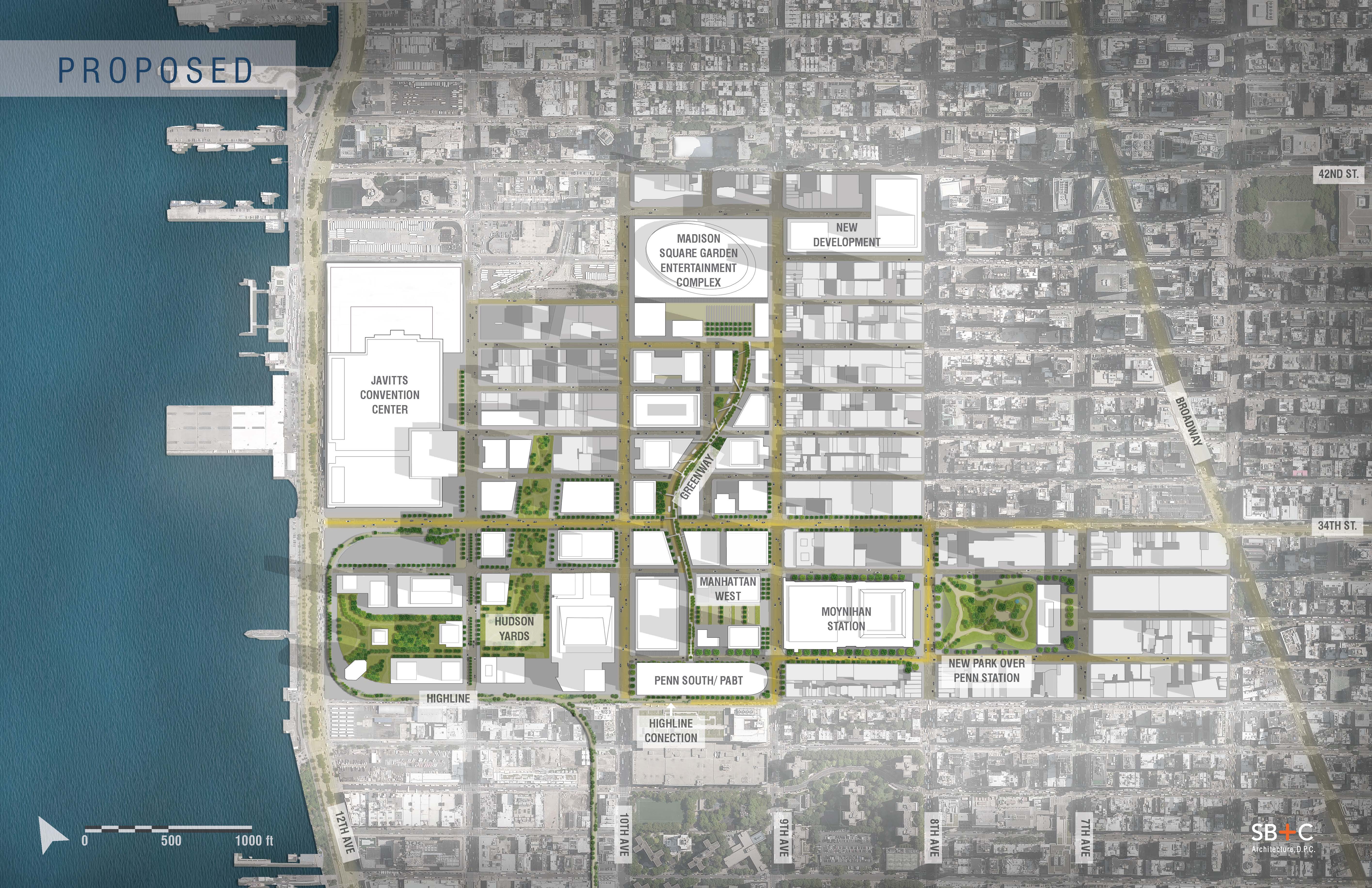 The proposed masterplan attempts to solve the existing road network connections which are currently barriers to pedestrian movement, and makes a direct underground connection to the Lincoln Tunnel. It extends the famous ‘Highline’, and generates a new network of public green spaces. By razing the above ground bus ramp, space is made for a larger more capable Madison Square Garden and entertainment complex.