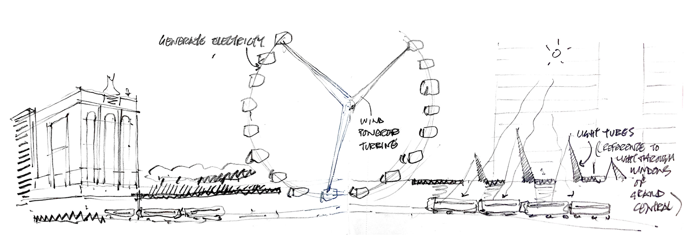Our concept has been inspired by the “expect the unexpected” concept. Our dual-purpose Wind Turbine, offers a dynamic viewing experience; from up close high-level views of Park Avenue Skyscrapers to unobstructed northern views for the length of Park Avenue and beyond; offering a first time perspective for the public to enjoy. And there is an environmentally conscious twist; it is powered by the wind passing between the buildings towards its strategic location and as the turbine slows down the energy is captured and stored for re-use or deployment elsewhere within the city.