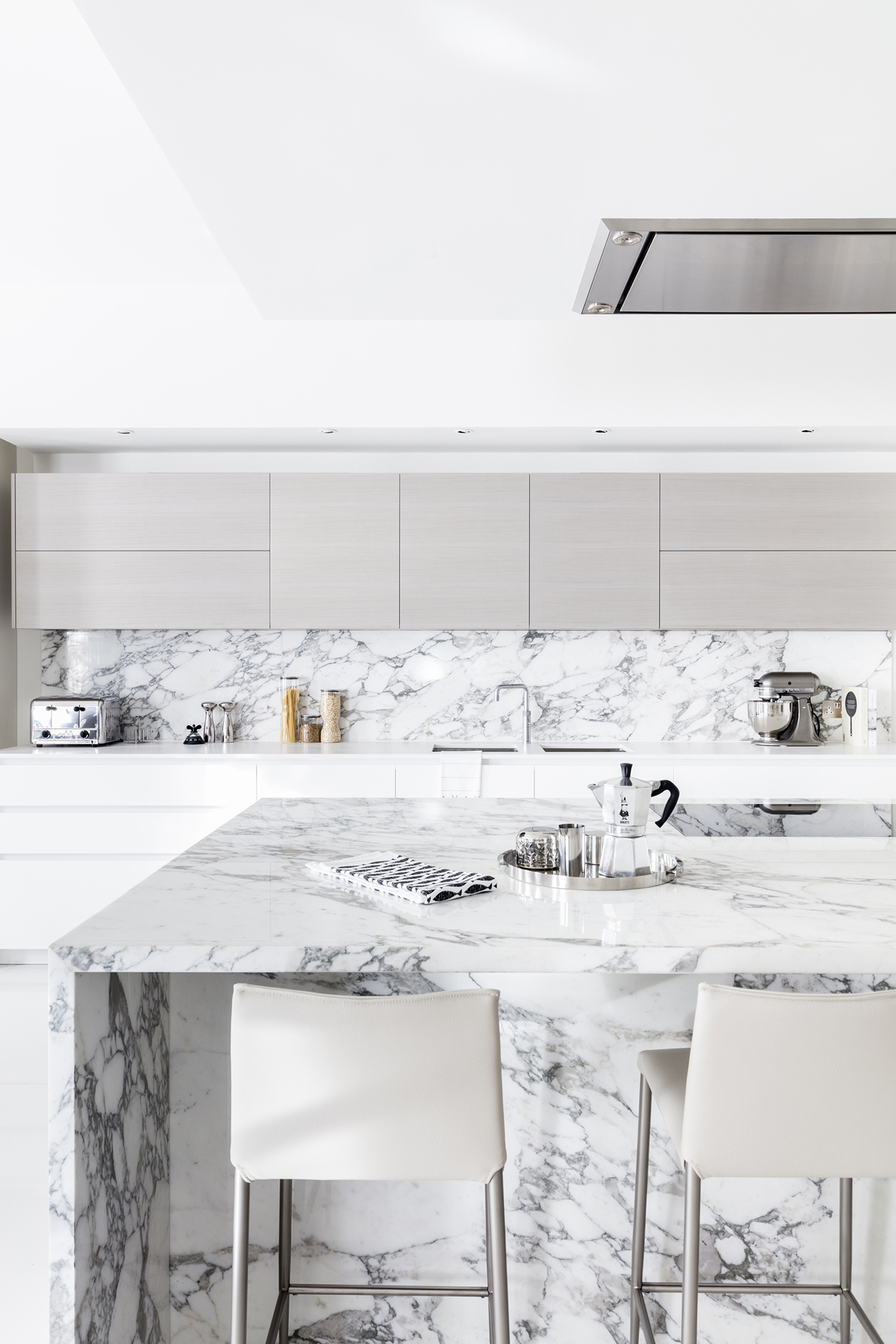 A marble clad feature wall with corner fireplace and recessed TV embodies the desired aesthetic whilst the minimalist Dada kitchen is both modern and functional. It has been meticulously designed in a modular formation to fit within wing walls and for sections to be concealed within pocket doors.