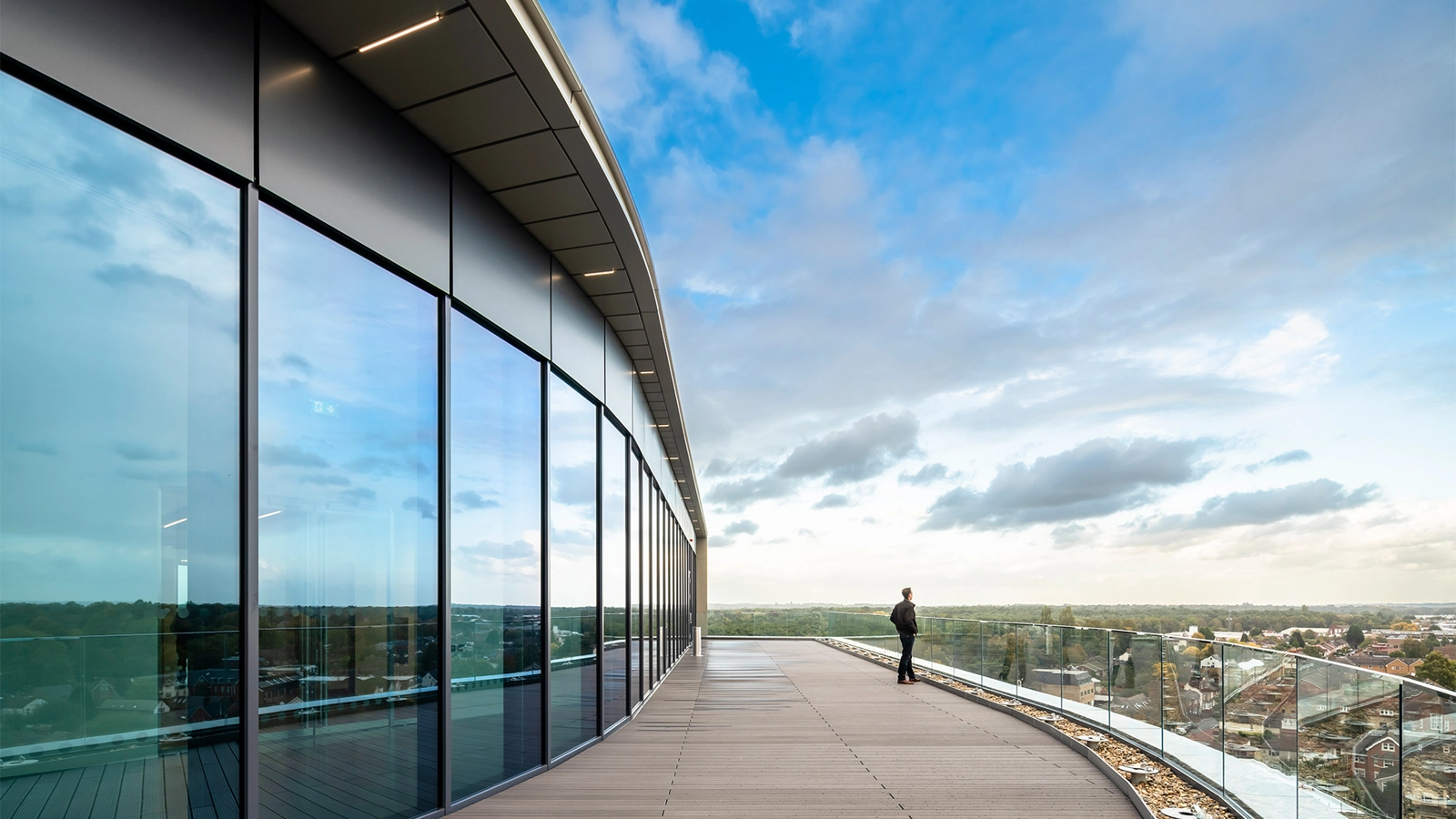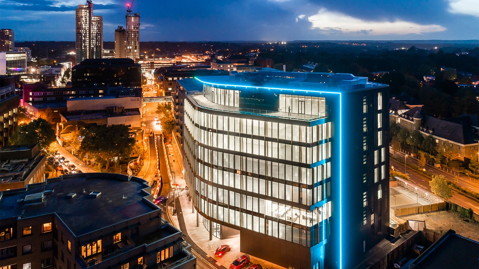 Our BREEAM ‘Excellent’ design has a commercial unit and main reception located at ground floor and a roof-top meeting suite and terrace overlooking Horsell common. An elegant, fully glazed façade maximises natural light throughout the building, providing impressive views of the surrounding landscape. Parking is provided at ground floor level and in a hidden basement.