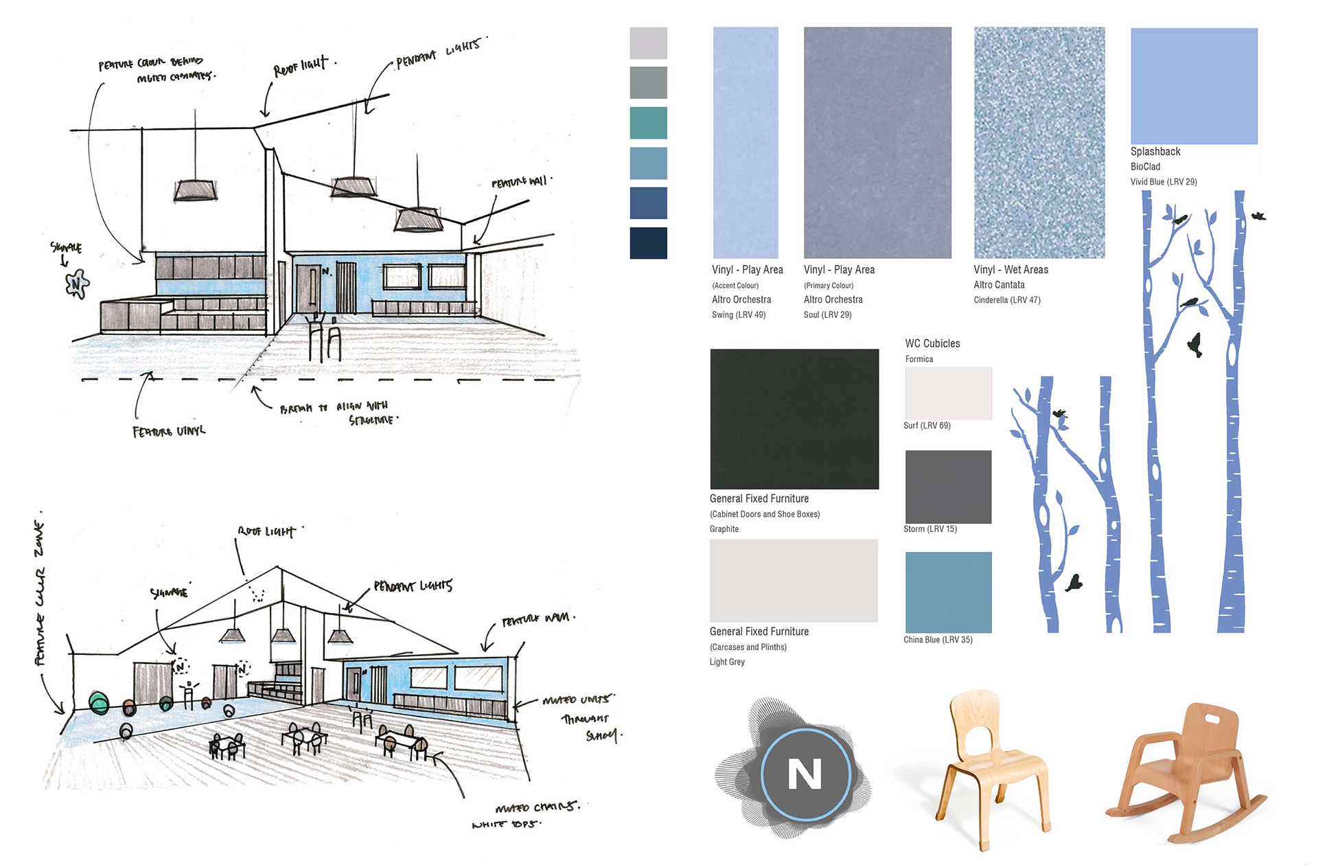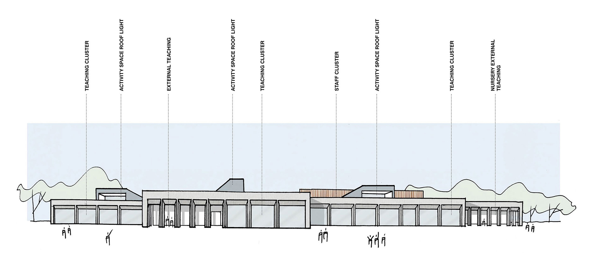 Our design is conceived around the strongest sustainable design principles. Comprising four teaching pavilions arranged around a core of community and assembly spaces. The teaching pavilions are clad in white concrete and each has a zinc-clad, hipped roof with lantern to illuminate the double-height flexible learning space at the heart of each classroom cluster. The core community and assembly spaces have flat roofs and timber cladding.