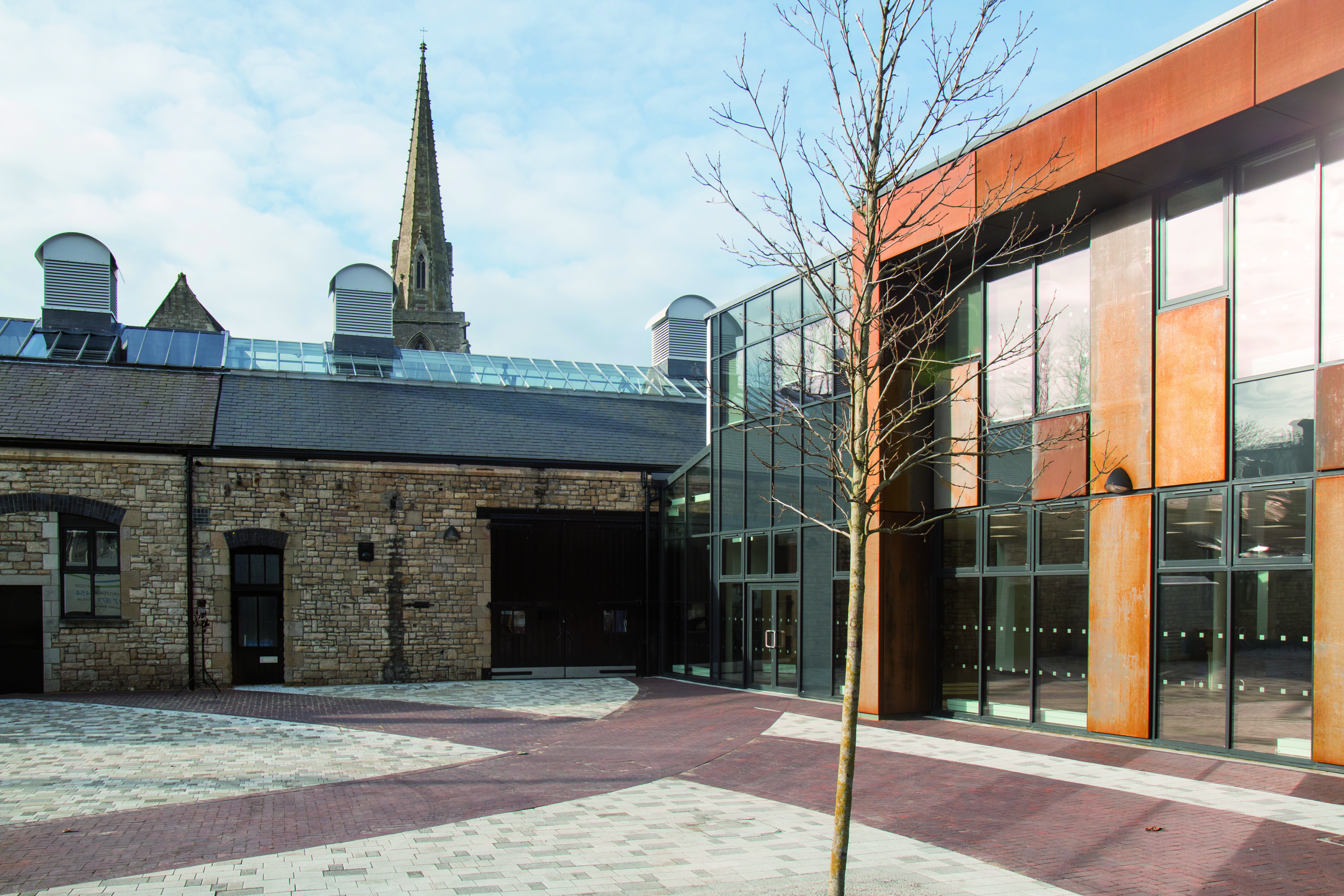 A central, new-build element connects the existing buildings and takes inspiration from the former Smithy. Glass and weathering steel distinguish this from the stone-built, historic structures.