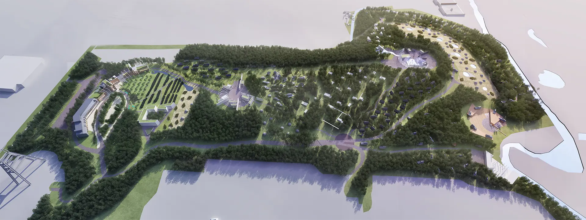 We were appointed to design the 44 hectare masterplan for a wellbeing and cultural visitor facility. With challenging topography, the masterplan has to address a substantial level change from the access road to the north down to Lugar Water, a famous river at the southern end of the site.
