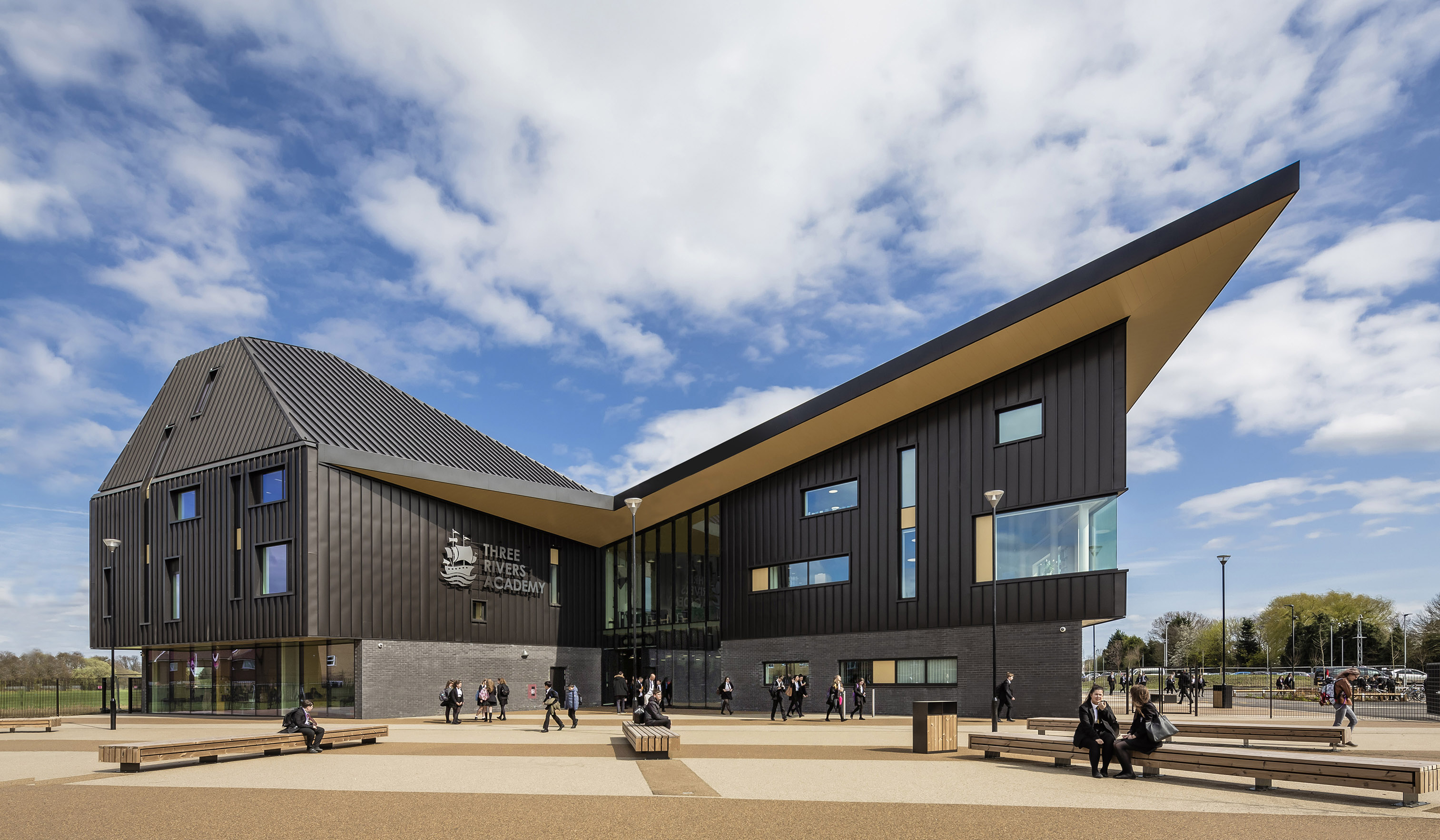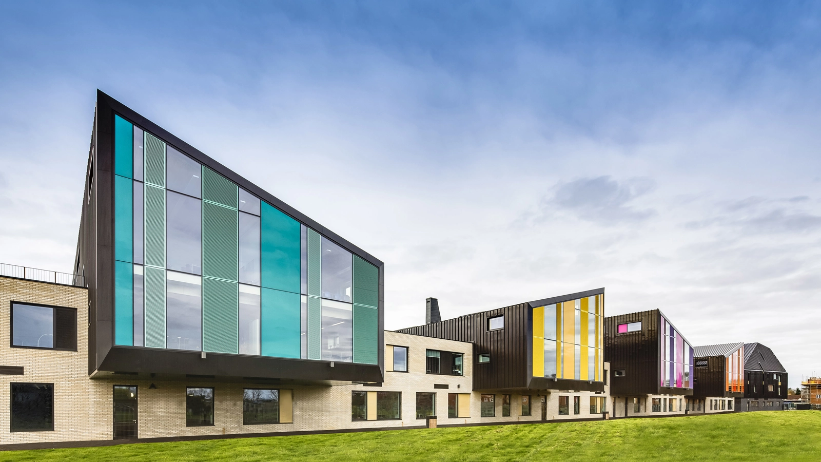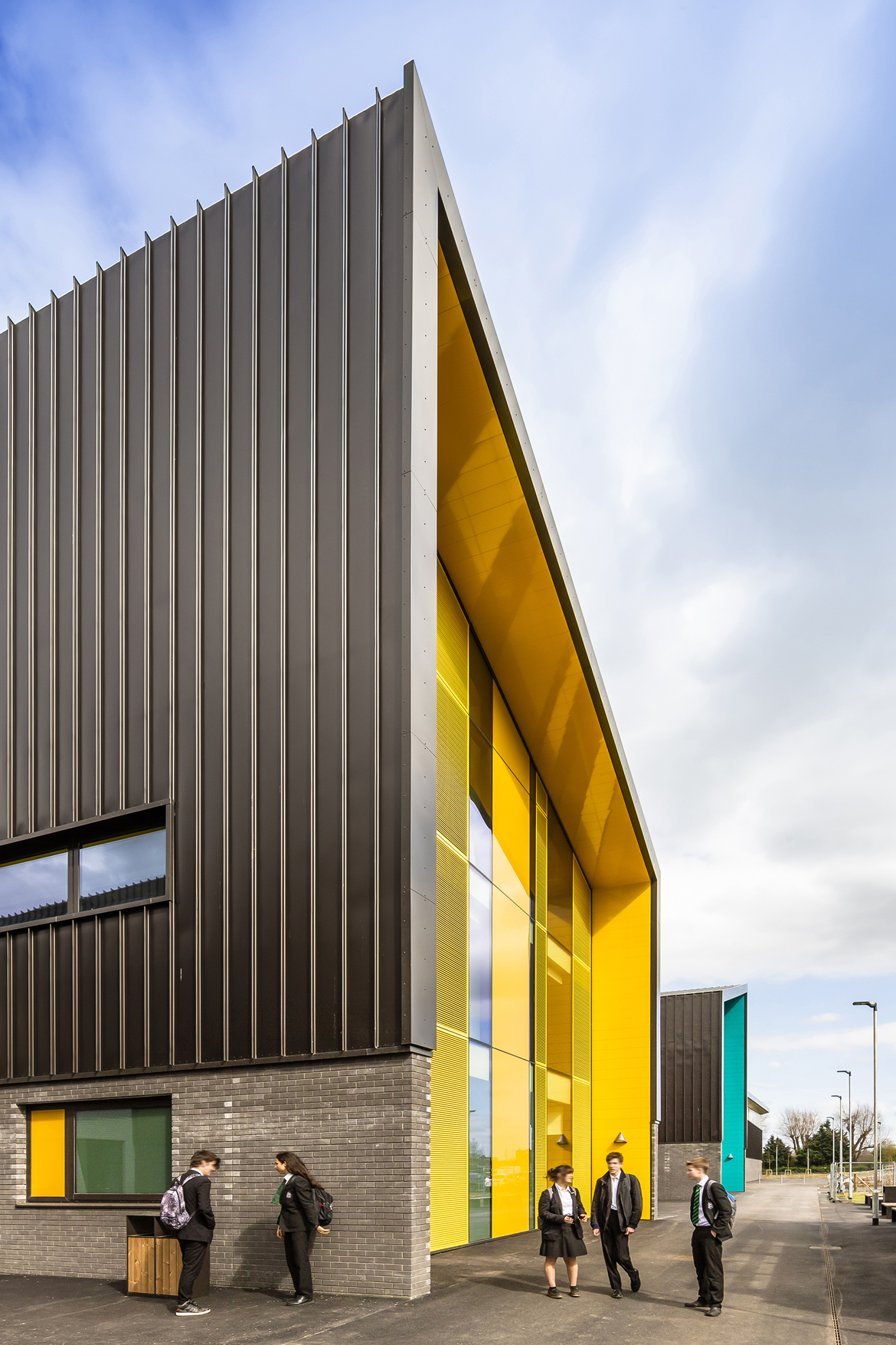 Conceptually, the building form has an almost creature-like configuration; with the 6th Form & Library at the head, specialist teaching rooms & the Mall forming the spine, while the Sports & Drama faculties combine to define the tail end. The articulated pastoral Houses, spring from the body like four separately coloured limbs to define a bold skyline and roofscape.