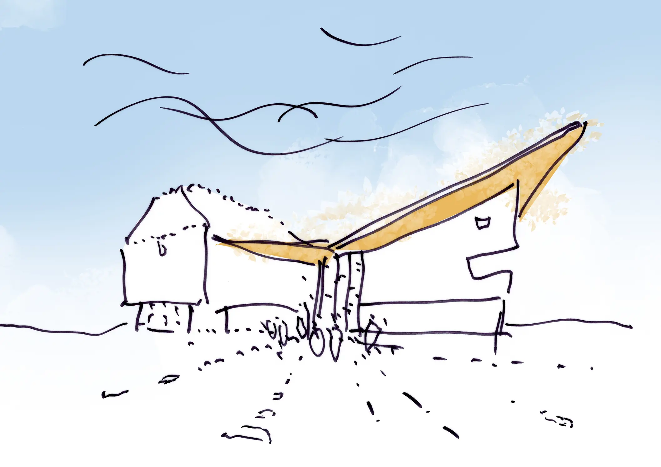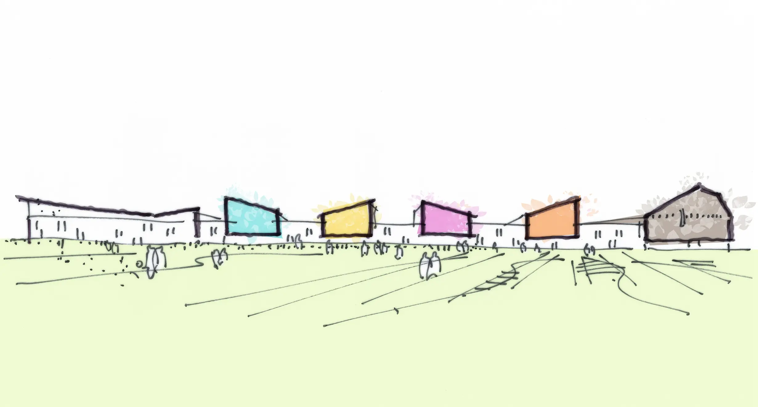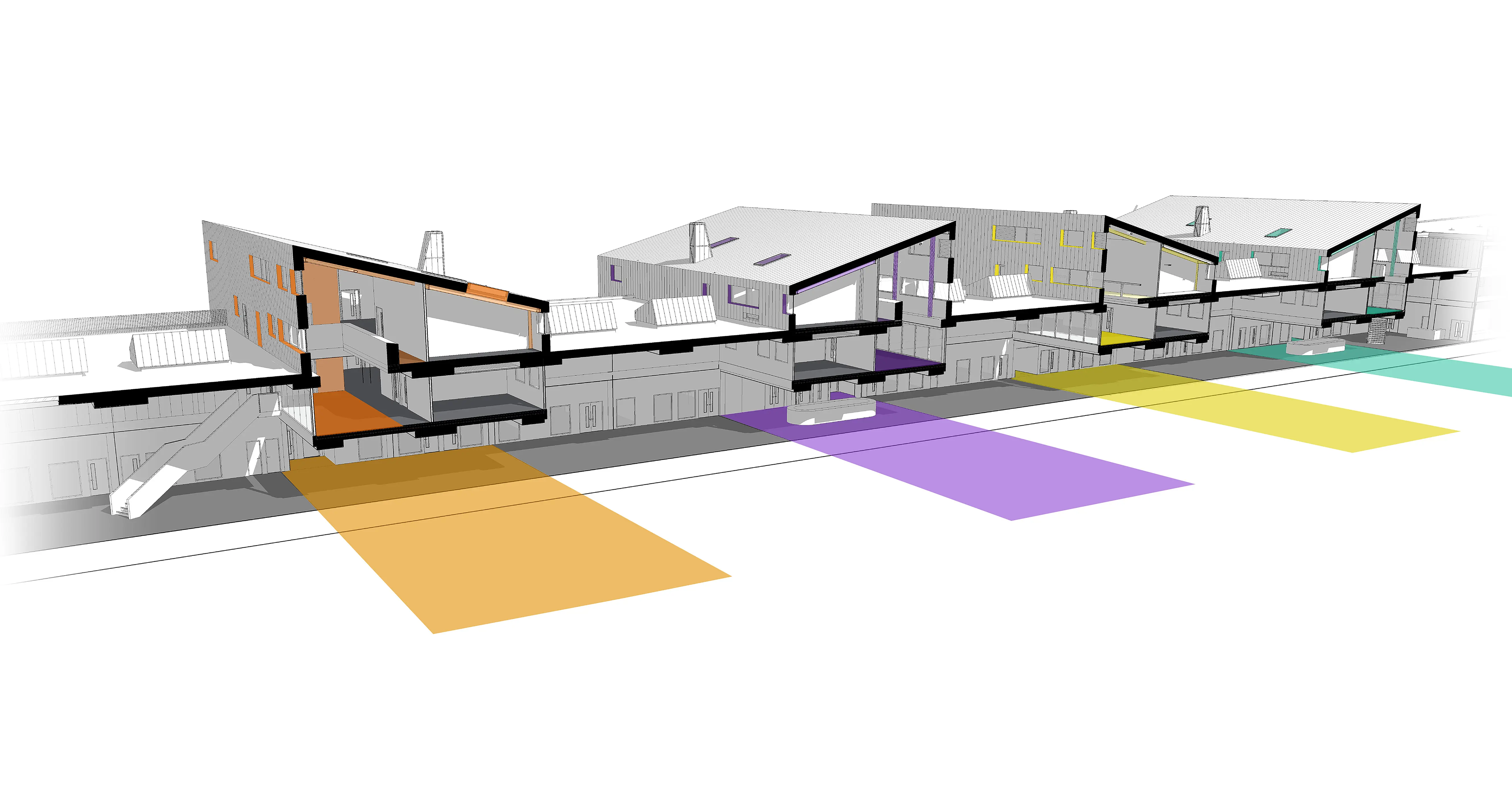 Conceptually, the building form has an almost creature-like configuration; with the 6th Form & Library at the head, specialist teaching rooms & the Mall forming the spine, while the Sports & Drama faculties combine to define the tail end. The articulated pastoral Houses, spring from the body like four separately coloured limbs to define a bold skyline and roofscape.