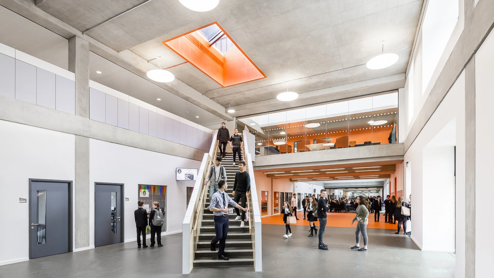 The spatial arrangement promotes creativity, independent thinking and learning – breaking away from the traditional ‘receiver of knowledge’ mentality. A 160 meter multi-use space, coined by the students as ‘the Mall’ flows through the entire length of the building and is at the heart of the student experience. Open-plan breakout spaces in each House faculty block encourage & facilitate shared learning experiences.