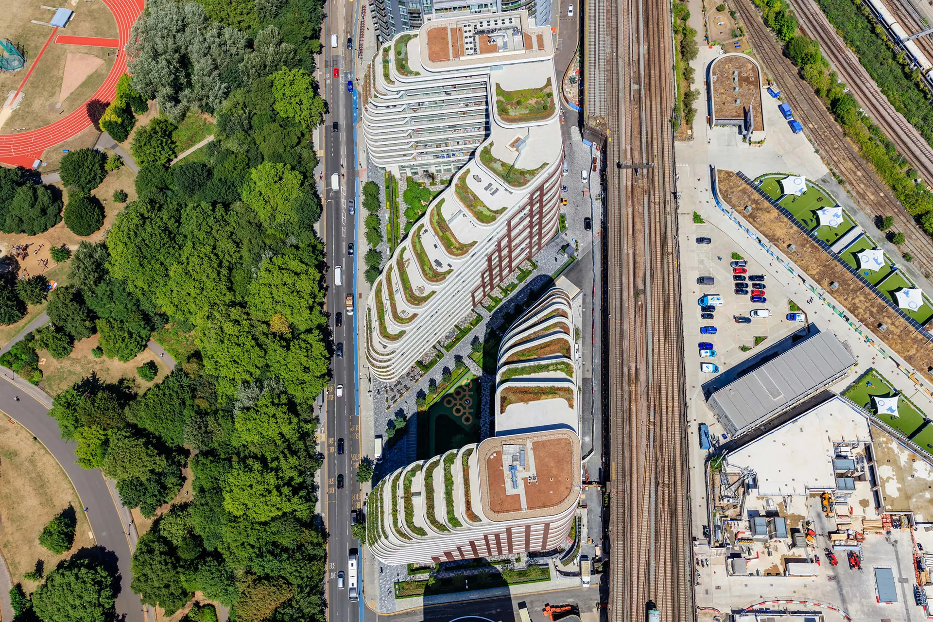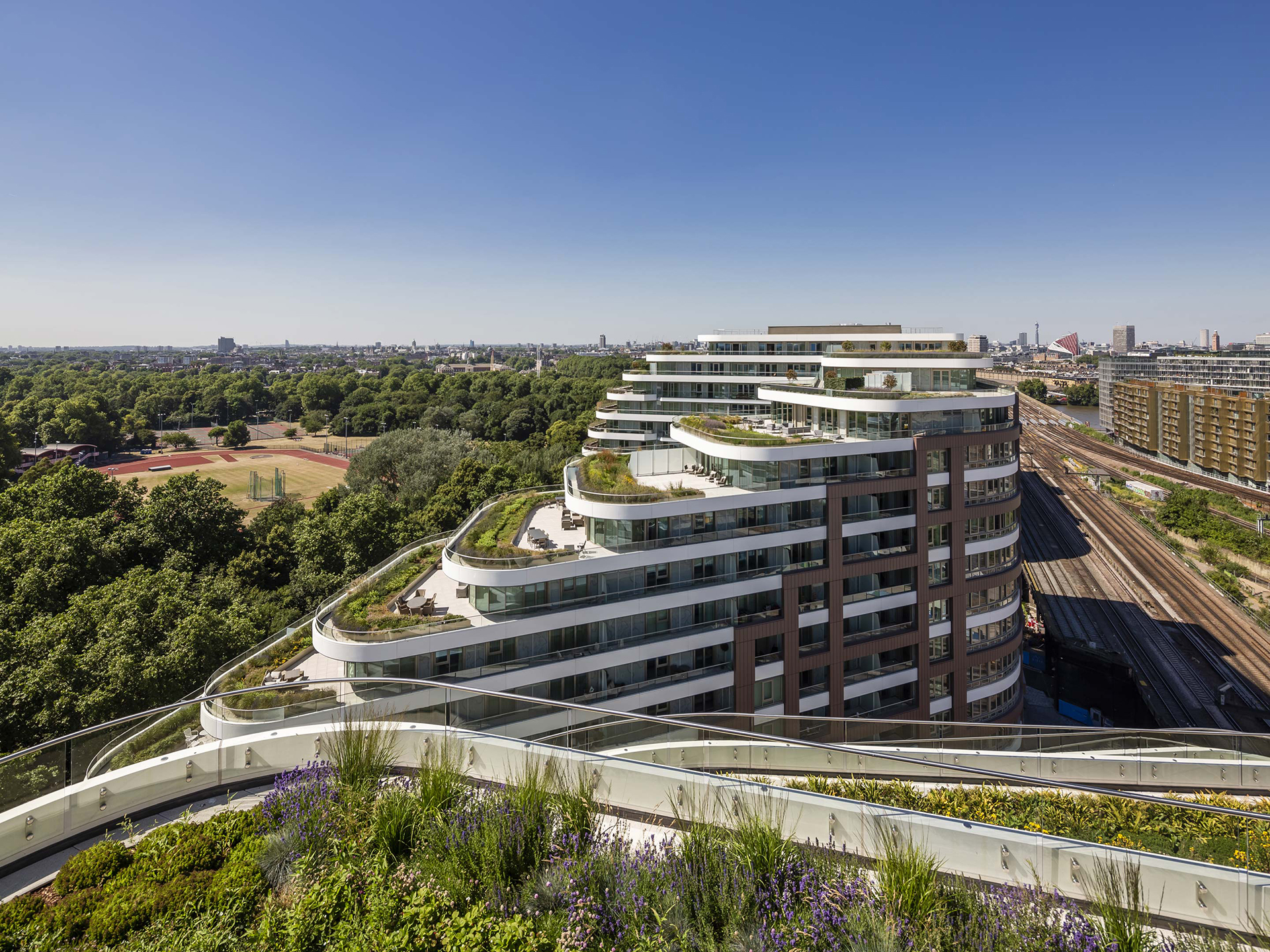 Our idea was to move away from the ubiquitous nature of London residential development. Our penthouses instead create a variety of private garden spaces that feel like an extension of the park thanks to infinity-style edge planting. The tightly controlled massing steps back to create an organic and curvilinear built form.
